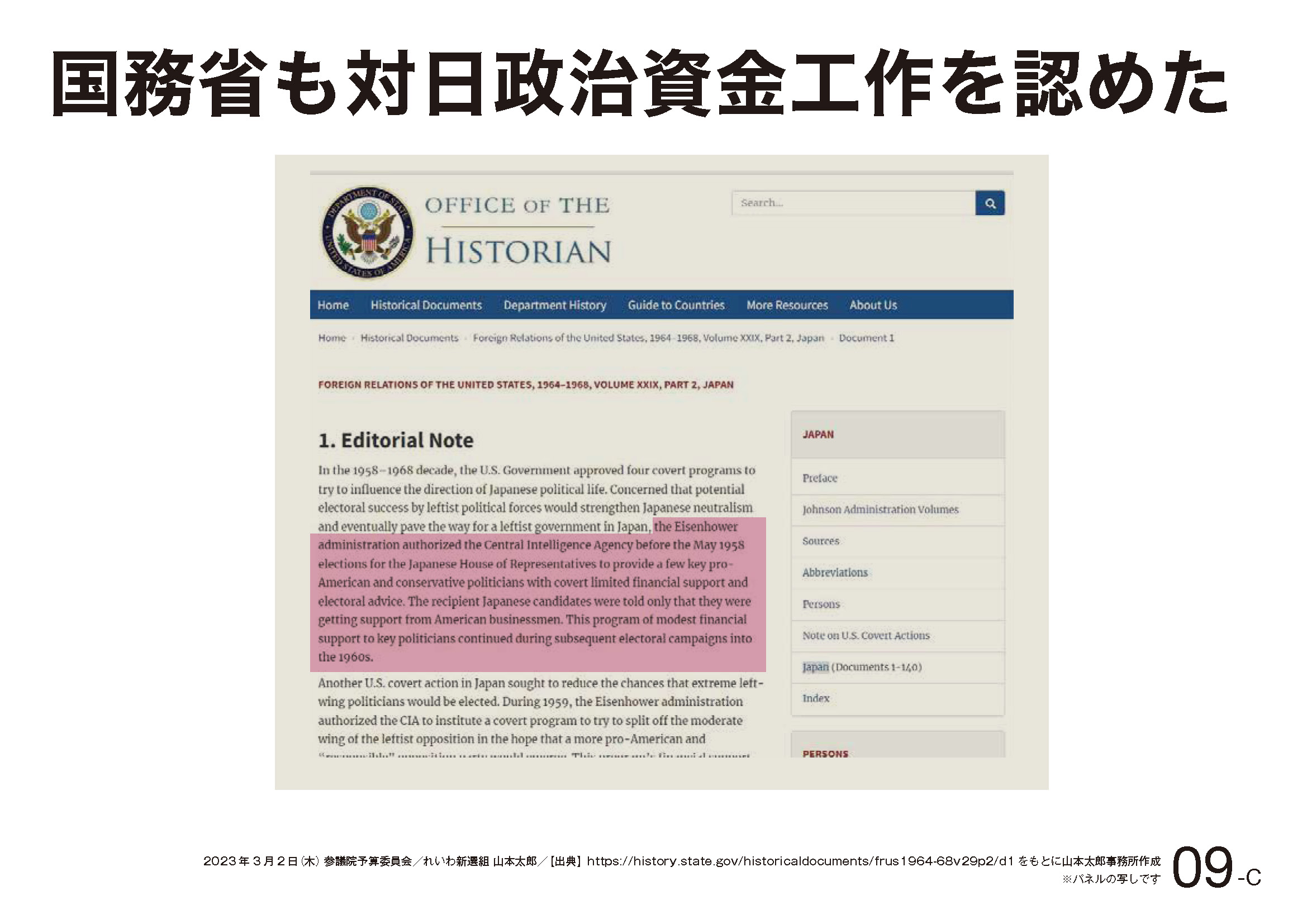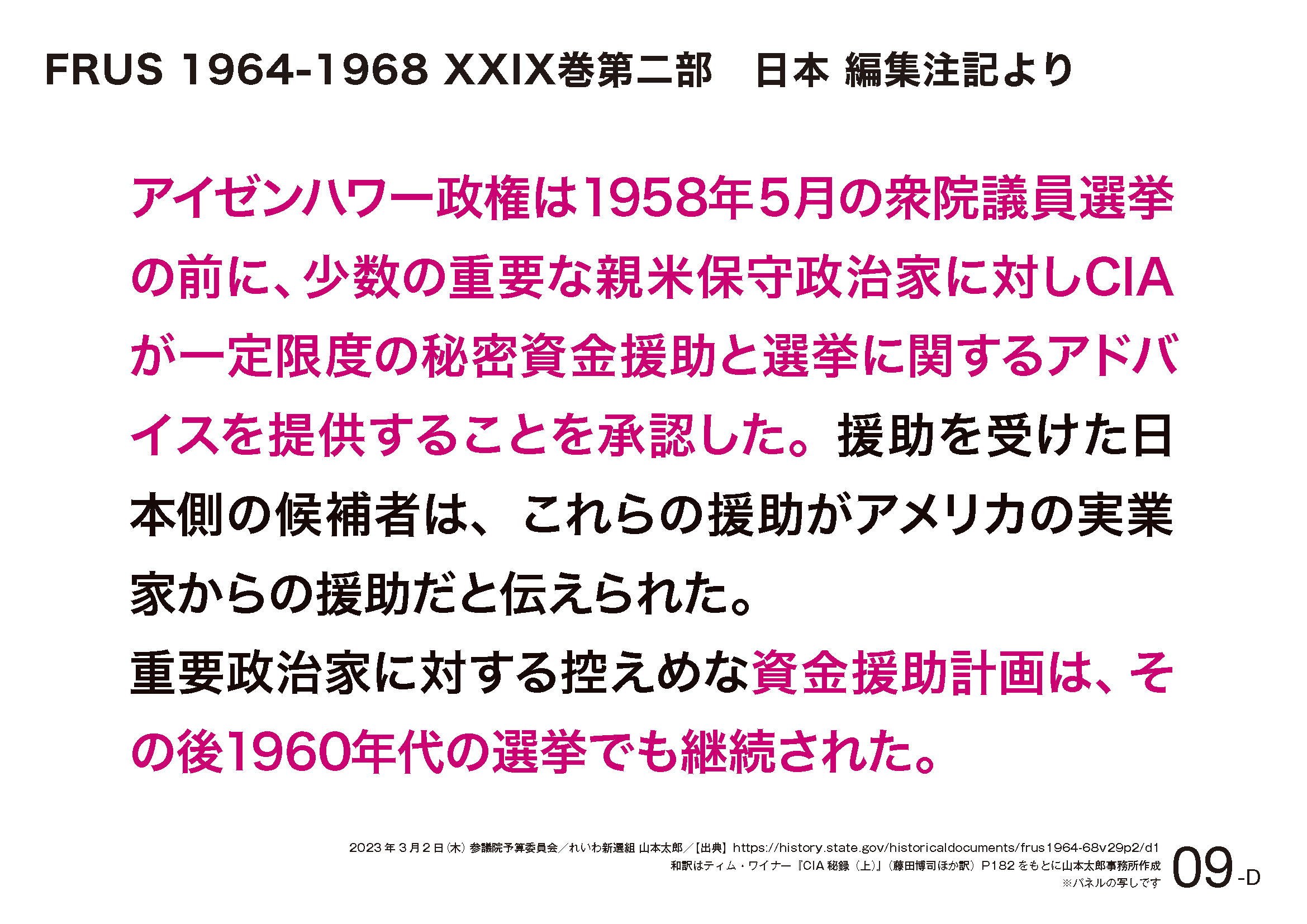 ニューヨーク・タイムズの騒ぎから十年たった後、資料の⑨C、⑨D、2006年7月、アメリカ国務省歴史部の資料。58年5月、衆院選挙前に、CIAが秘密資金援助や選挙アドバイスを与えることを許可。支援を受けた候補者には、アメリカの企業家から援助を受けていると伝えられた。この支援計画、その後の60年代の選挙運動中も続けられたと。