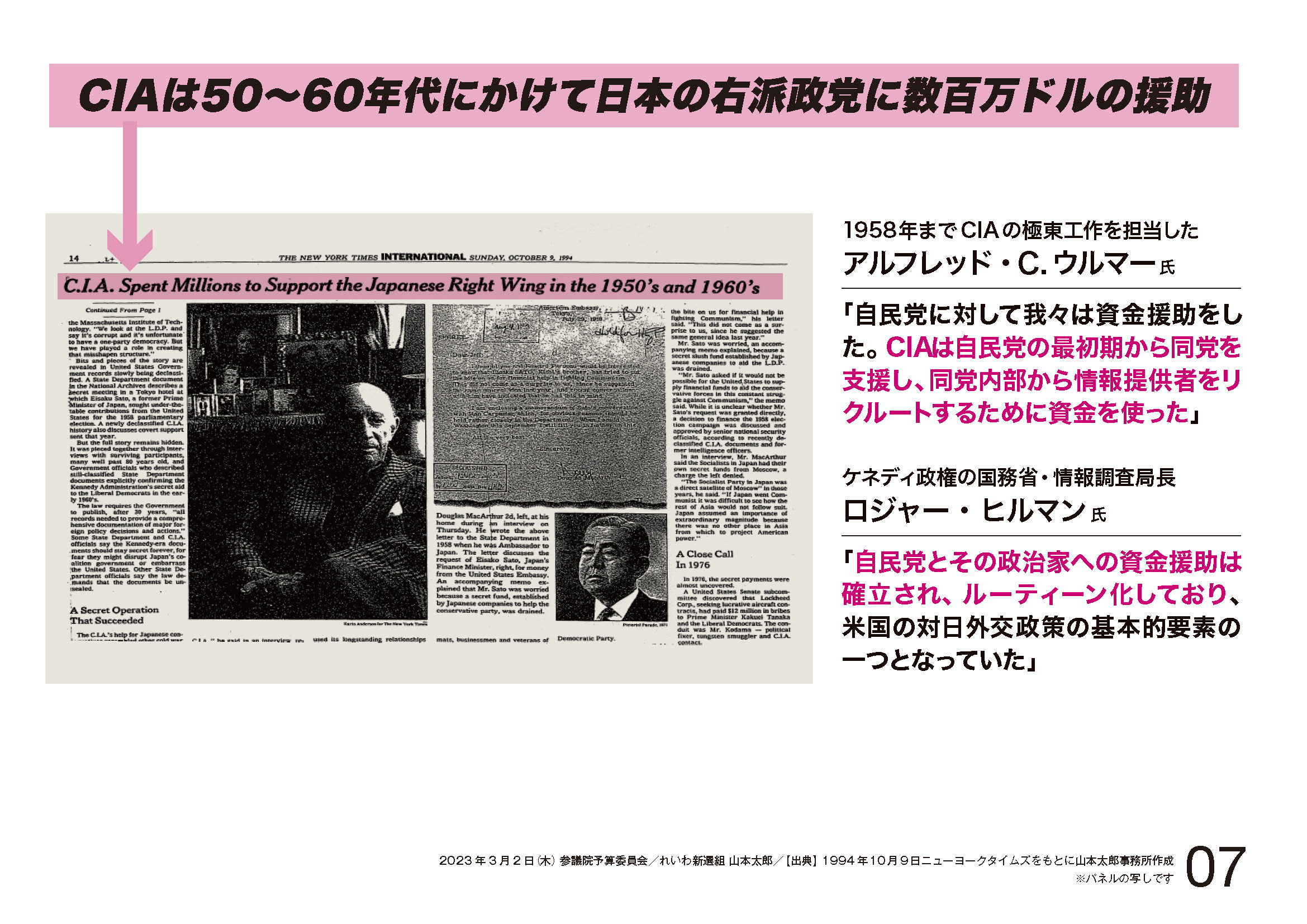 資料の⑦、1994年10月、ニューヨーク・タイムズ記事。(資料提示)1958年までCIAの極東工作を担当、アルフレッド・ウルマー氏、自民党に対して我々は資金援助をした、CIAは自民党の最初期から同党を支援、内部から情報提供者をリクルートするために資金を使った。