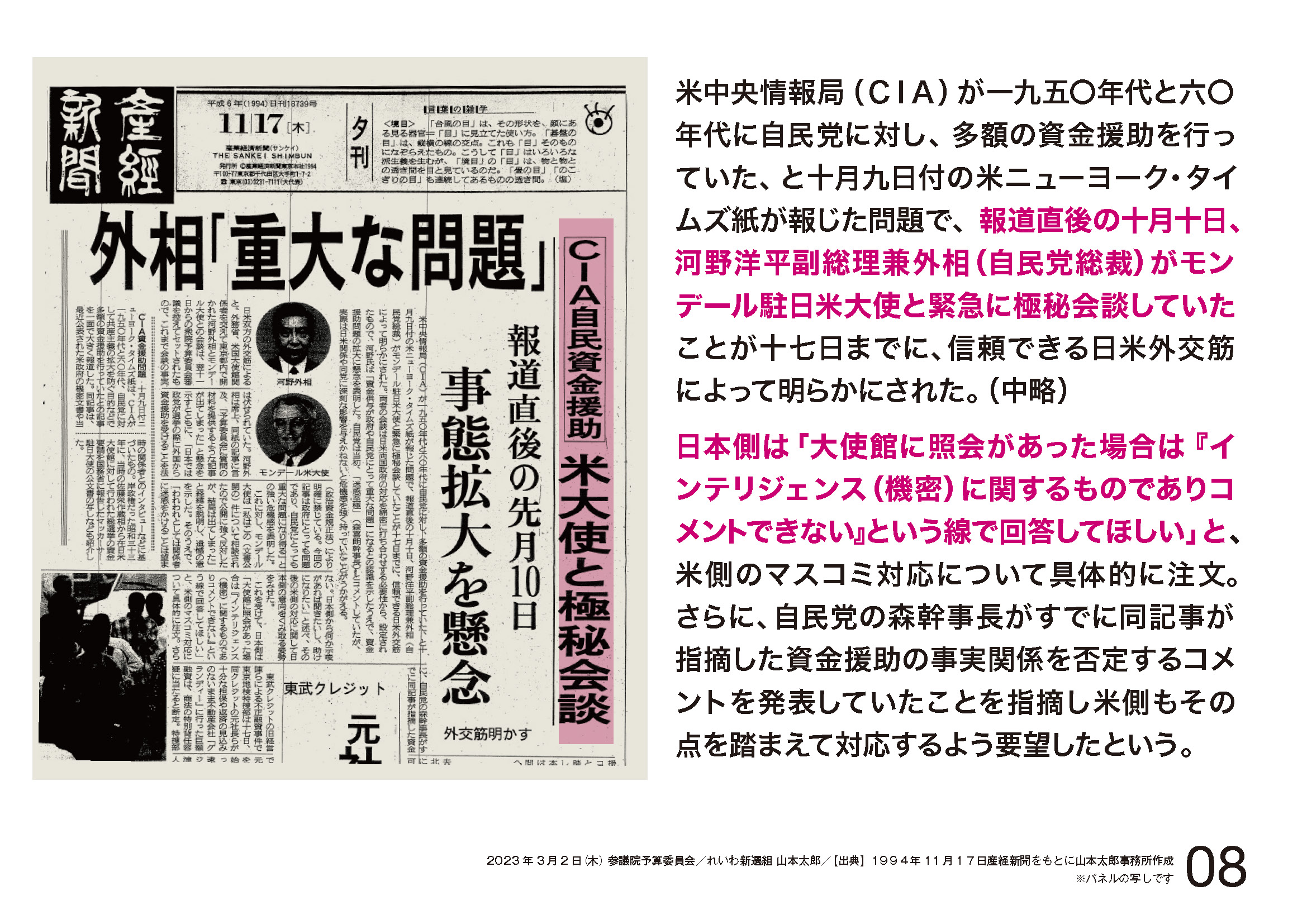 資料の⑧、94年11月、産経新聞。当時の自民党総裁、アメリカ大使と極秘会談、資金援助について大使館に照会があった場合はインテリジェンスに関するものでありコメントできないという線で回答してほしいとアメリカ側のメディア対応に注文を付ける。自民党の森幹事長が既に資金援助の事実関係を否定するコメントを発表していたので、アメリカ側にもこの点を踏まえて対応してくださいとお願いしたと。ごまかしても無理だよ、公文書残っているもんということなんですね。