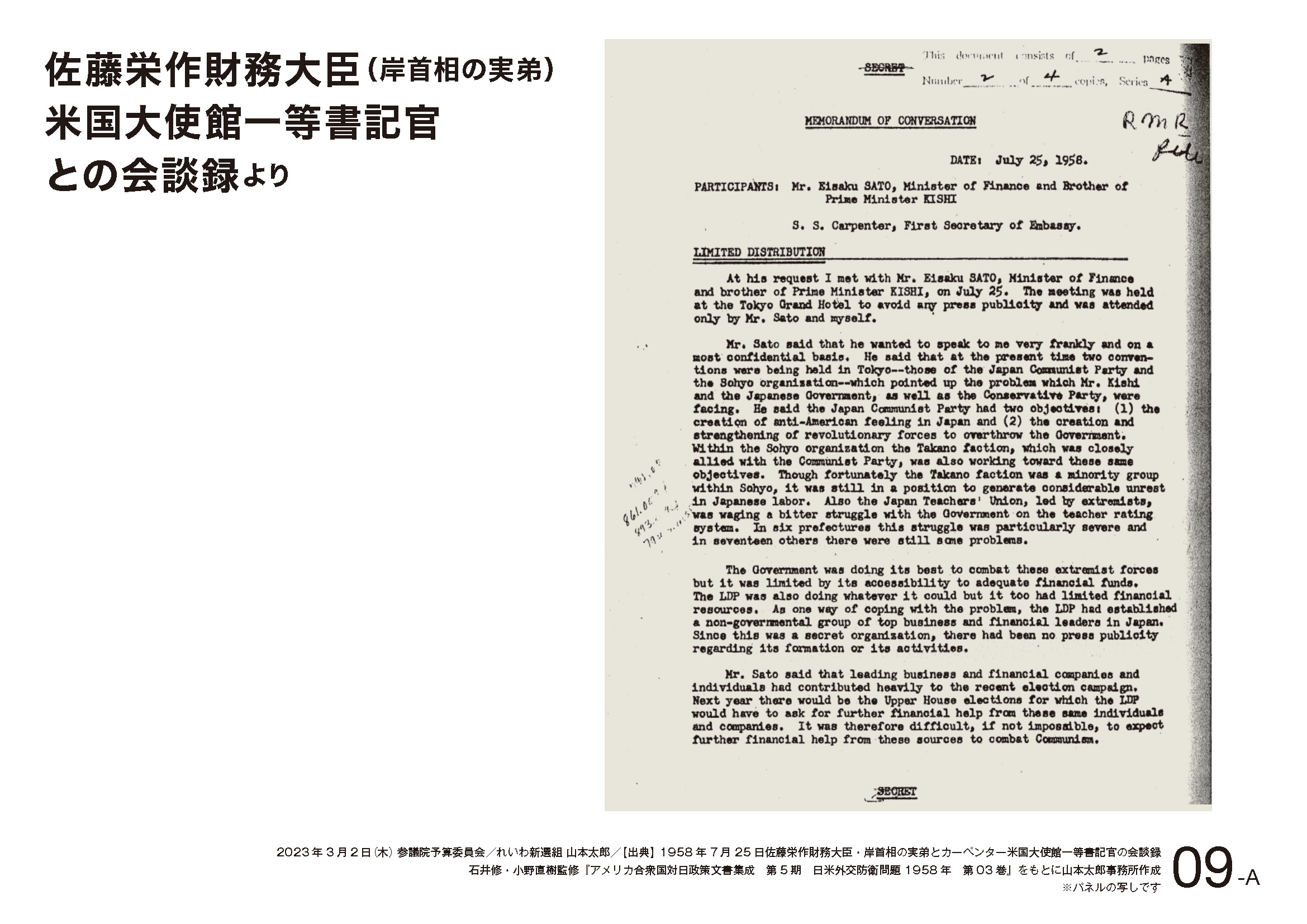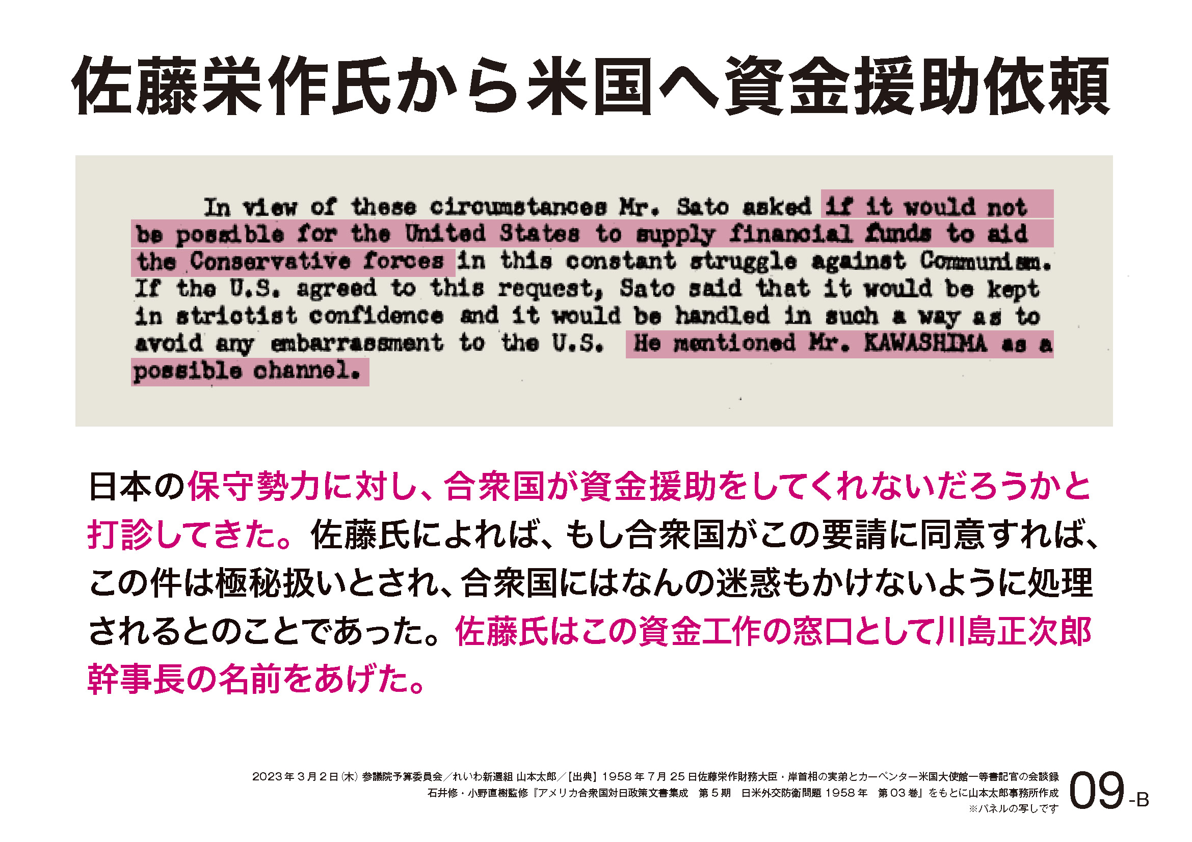 資料の⑨A、⑨B、1958年7月、アメリカ大使館一等書記官と佐藤栄作財務大臣の会談。もし合衆国がこの要請に同意すれば、この件は極秘扱いとされ、合衆国には何の迷惑も掛けないよう処理されるとのことであった。佐藤氏は、この資金工作の窓口として川島正次郎幹事長の名前を挙げた。外国勢力に金を無心、金をせびり続けてきたのが歴代自民党。