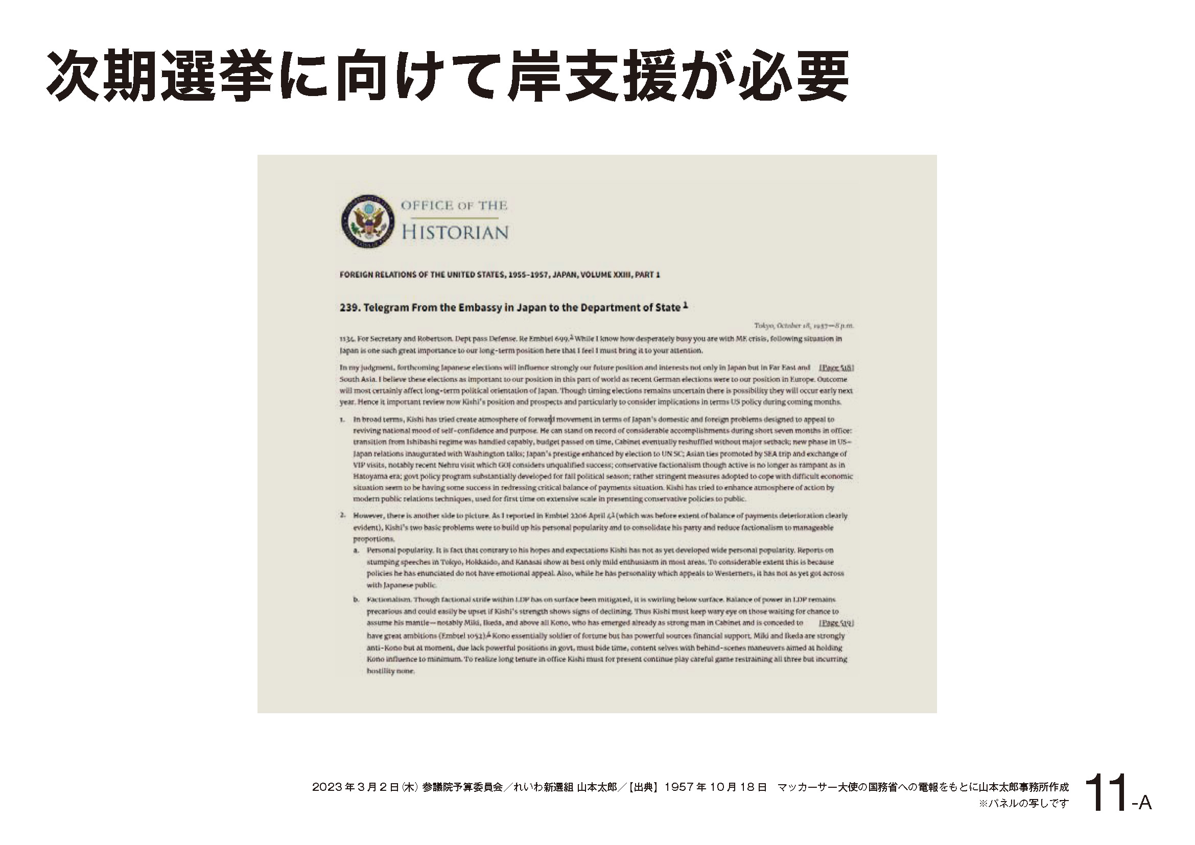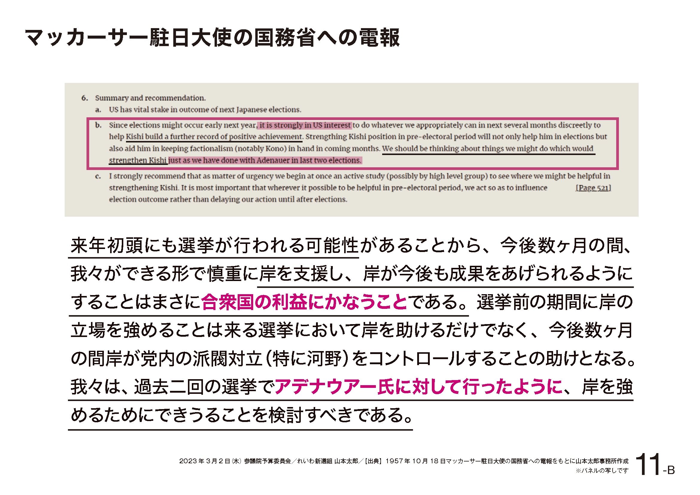 資料の⑪A、⑪B、1957年10月、アメリカ大使から国務省への電報。最も重要なアンダーライン部分をお読みします。来年初頭にも選挙が行われる可能性、岸を支援し、岸が今後も成果を上げられるようにすることはまさに合衆国の利益にかなうこと、我々は、過去2回の選挙でアデナウアー氏に対して行ったよう、岸を強めるためにでき得ることを検討すべき。2つの赤字、特に重要です。