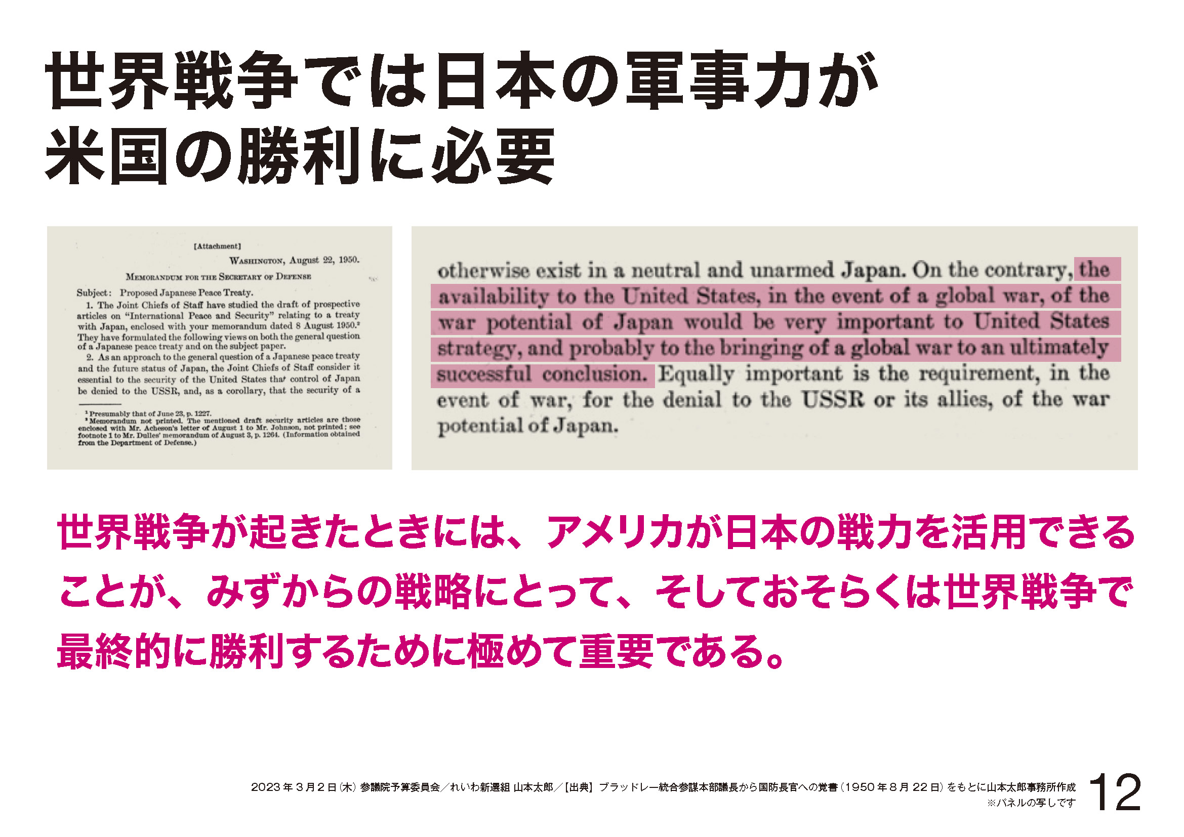 資料の⑫、過去の公文書を見ると、世界戦争では日本の軍事力がアメリカの勝利に必要だそうです。アメリカは、自国の覇権、帝国の拡大のためには手段選ばない。