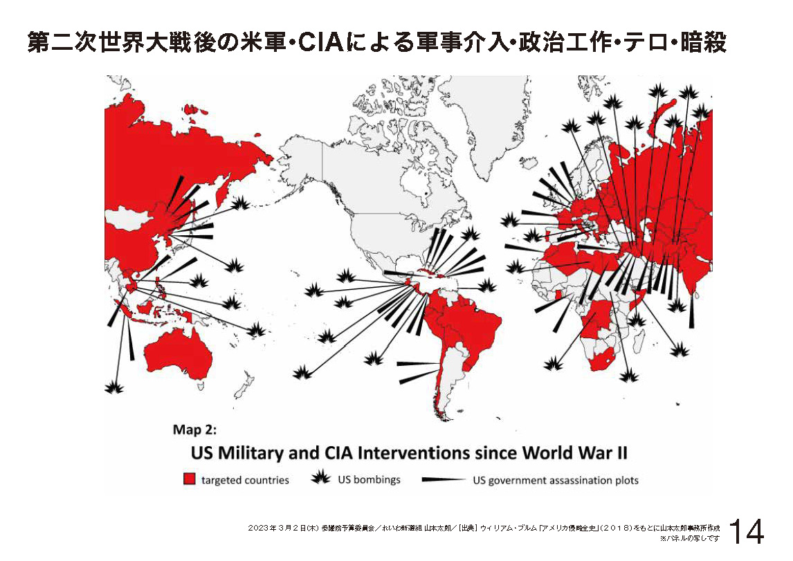 資料の⑭、アメリカ国務省の元外交官、ジャーナリスト、ウィリアム・ブルム氏。第二次大戦以降、アメリカは、50か国以上の外国政府の転覆、50人以上の国家指導者の暗殺を試み、30か国以上で人々の頭上に爆弾を投下したという。
