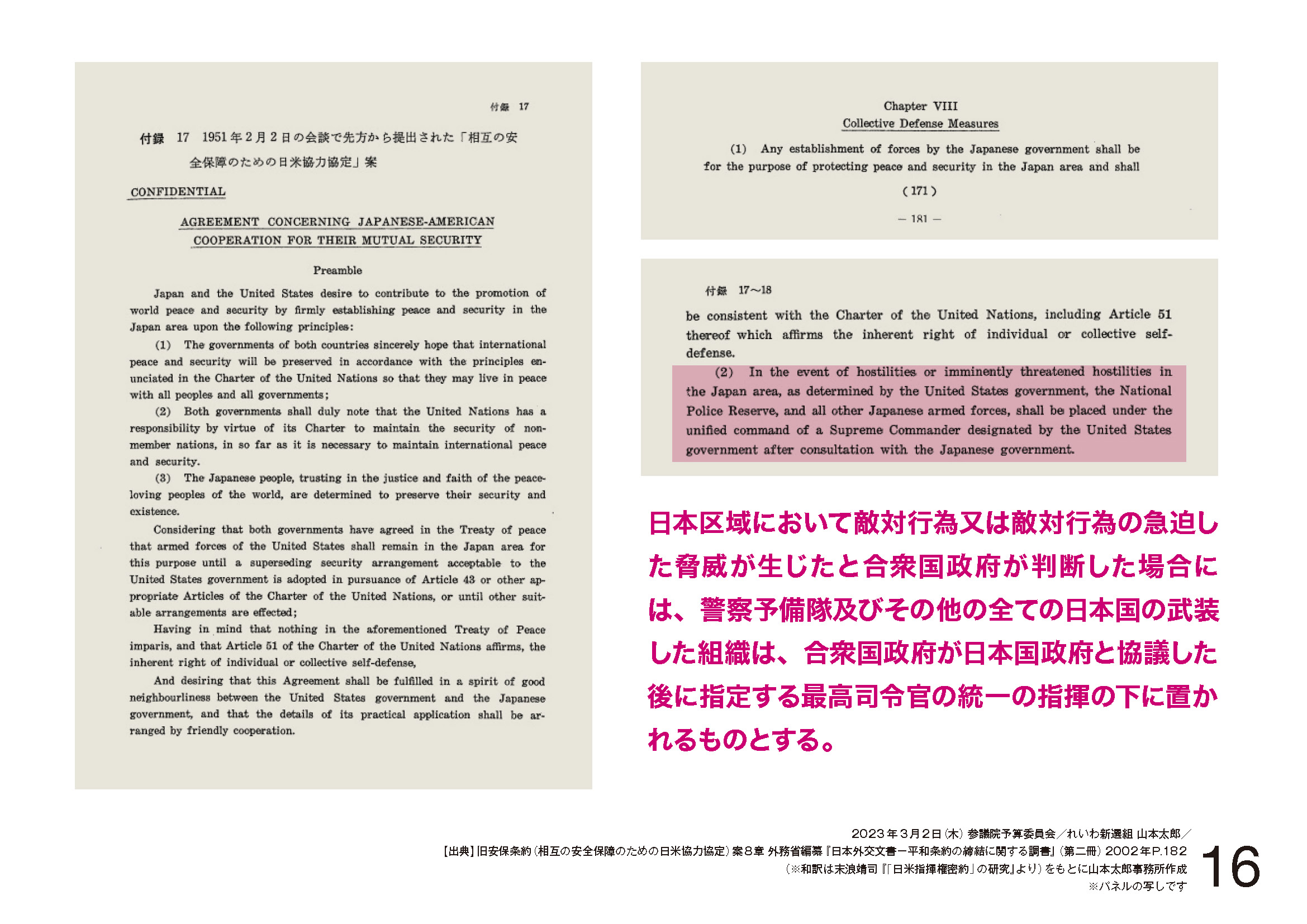 ○山本太郎君 米軍の指揮下に置く規定を表向きは削除する。その裏では、米軍の指揮下に置くということにした。
