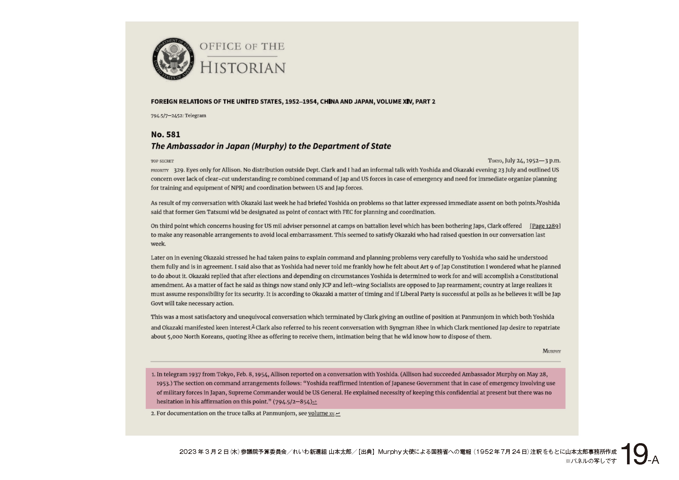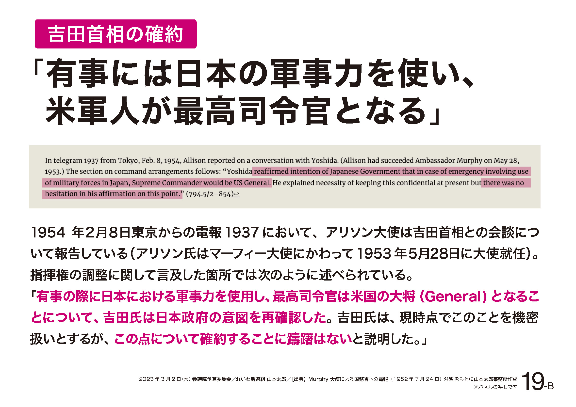 資料⑲A、⑲B、1954年2月8日、アリソン大使と吉田茂首相の会談報告。有事の際に日本における軍事力を使用し、最高司令官は米国の大将、ジェネラルとなることについて日本政府の意図を再確認した。吉田氏は、現時点ではこのことは機密扱いとするが、この点について確約することにちゅうちょはないと説明。この会談後、半年もたたず自衛隊創設。協議するという建前だけで自衛隊を米国の支配下に置く仕組み、岸信介が新安保へと引き継ぎます。