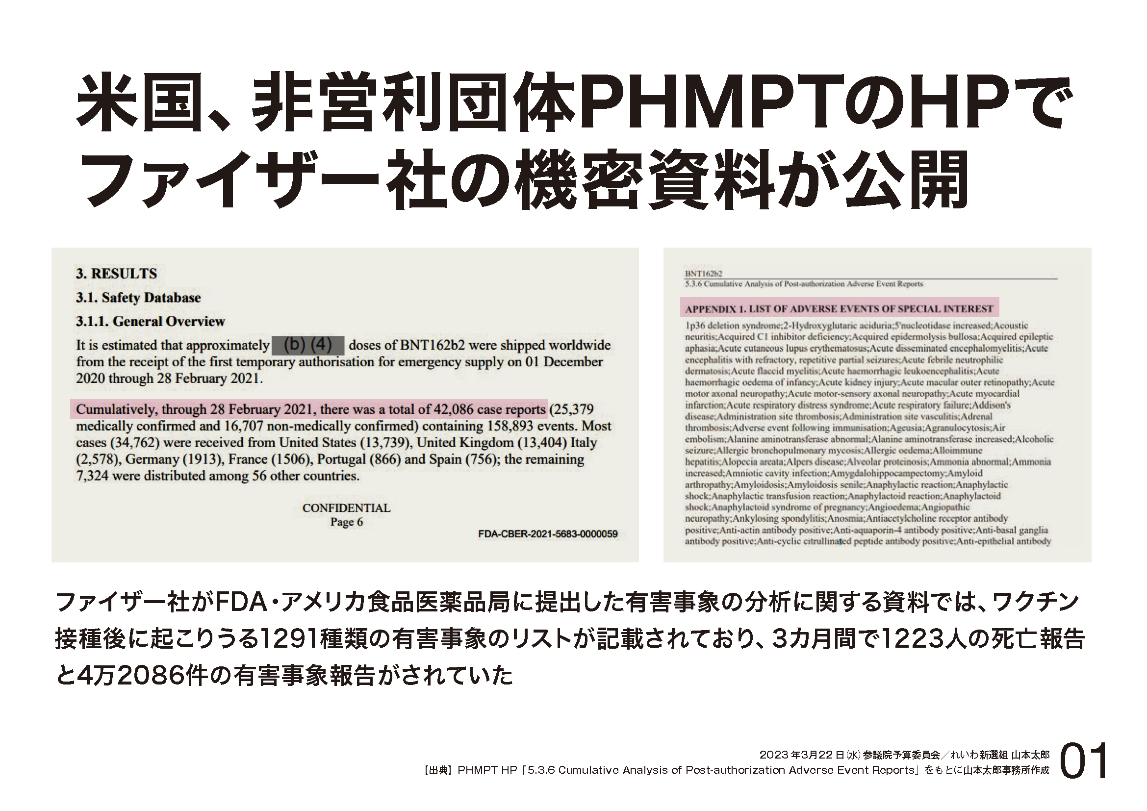 ○山本太郎君 資料の①。アメリカでは、ファイザー社などがFDAに提出した資料の開示を求めて裁判、開示となった機密資料がホームページで公開。そこには、2021年2月28日までの3か月間で、接種後の死亡報告が1223人、有害事象は42086件、ワクチン接種後に起こり得る1291種類の有害事象のリストが記載されていたと。