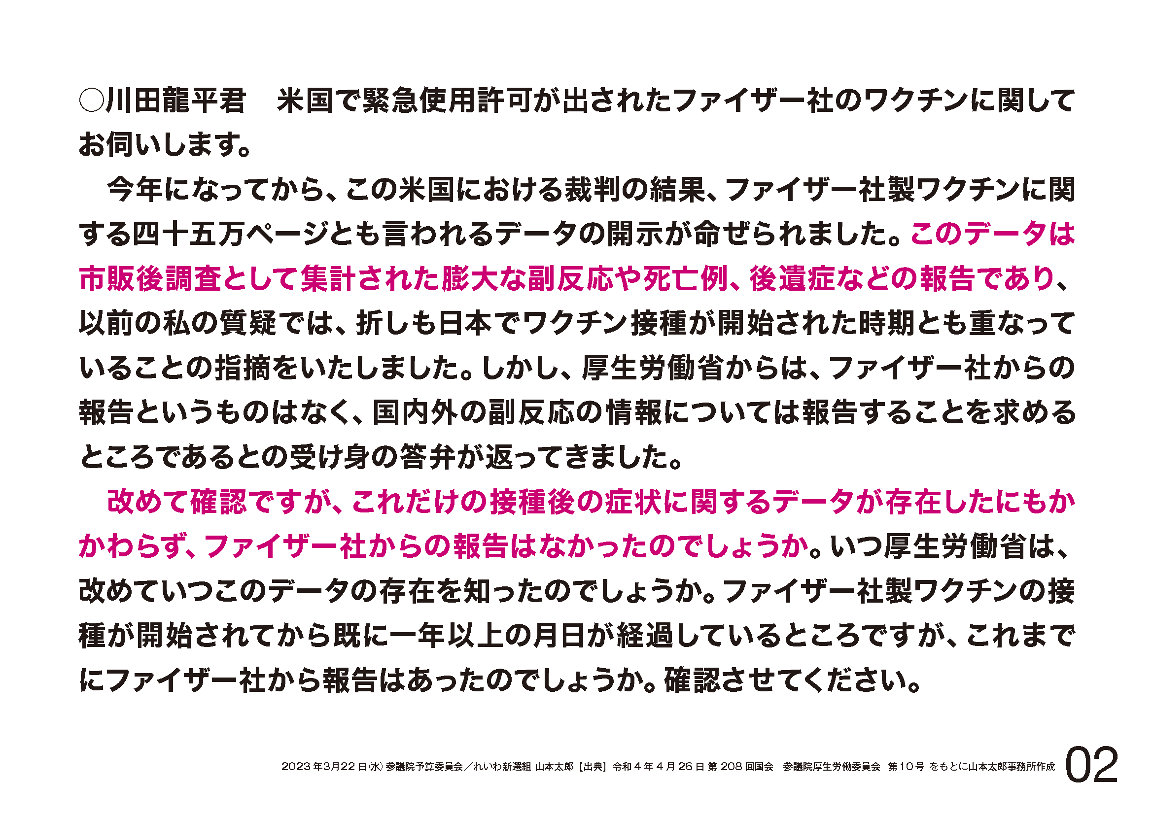 資料の②、議事録。昨年4月、このデータについて、厚労委員会、川田議員から、ファイザーから報告はなかったか、データの存在を知ったのはいつかとの質問に、この質疑で知った、専門家に諮り、その結果を国民の皆様に情報発信したいと考えていると厚労省は答弁。この件、どうなりました。