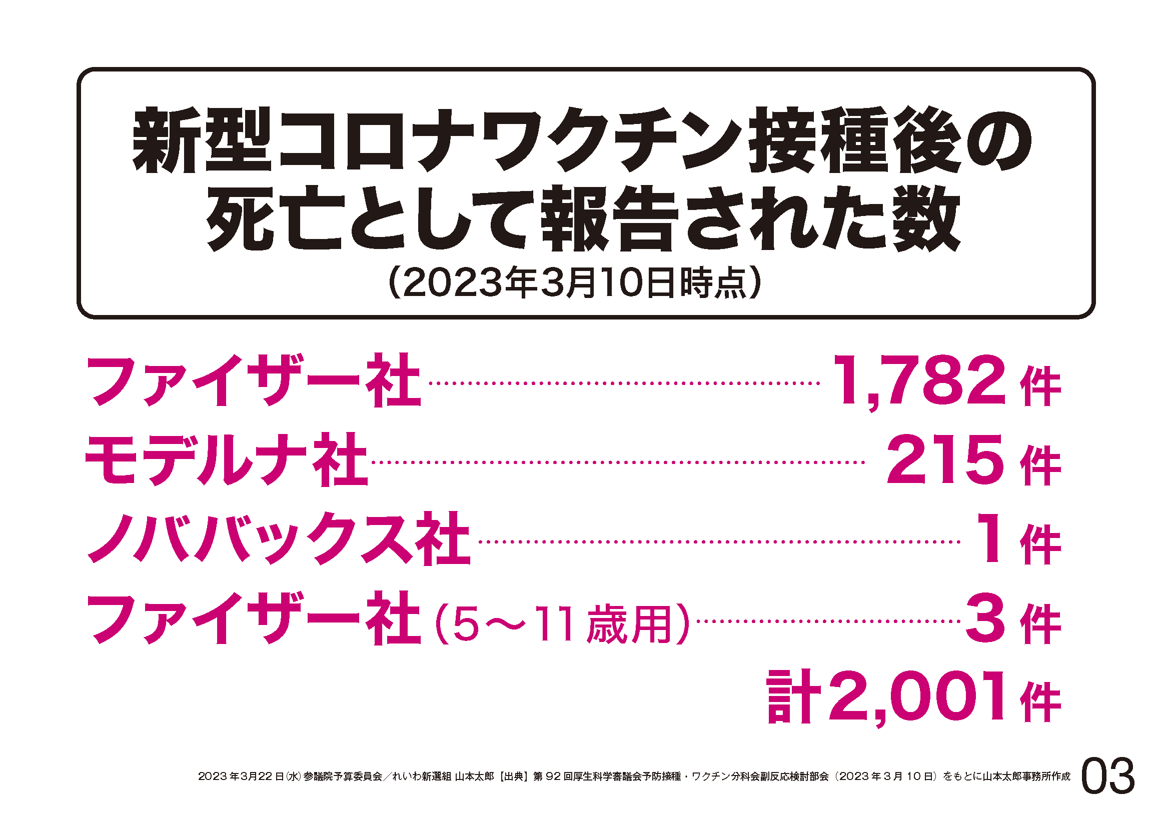 死亡例2001件のうちアルファ以外ということで、ワクチンと死亡との因果関係が認められないもの、これは11件、情報不足等によりワクチンと死亡との因果関係が評価できないもの、これが1989件となってございます。