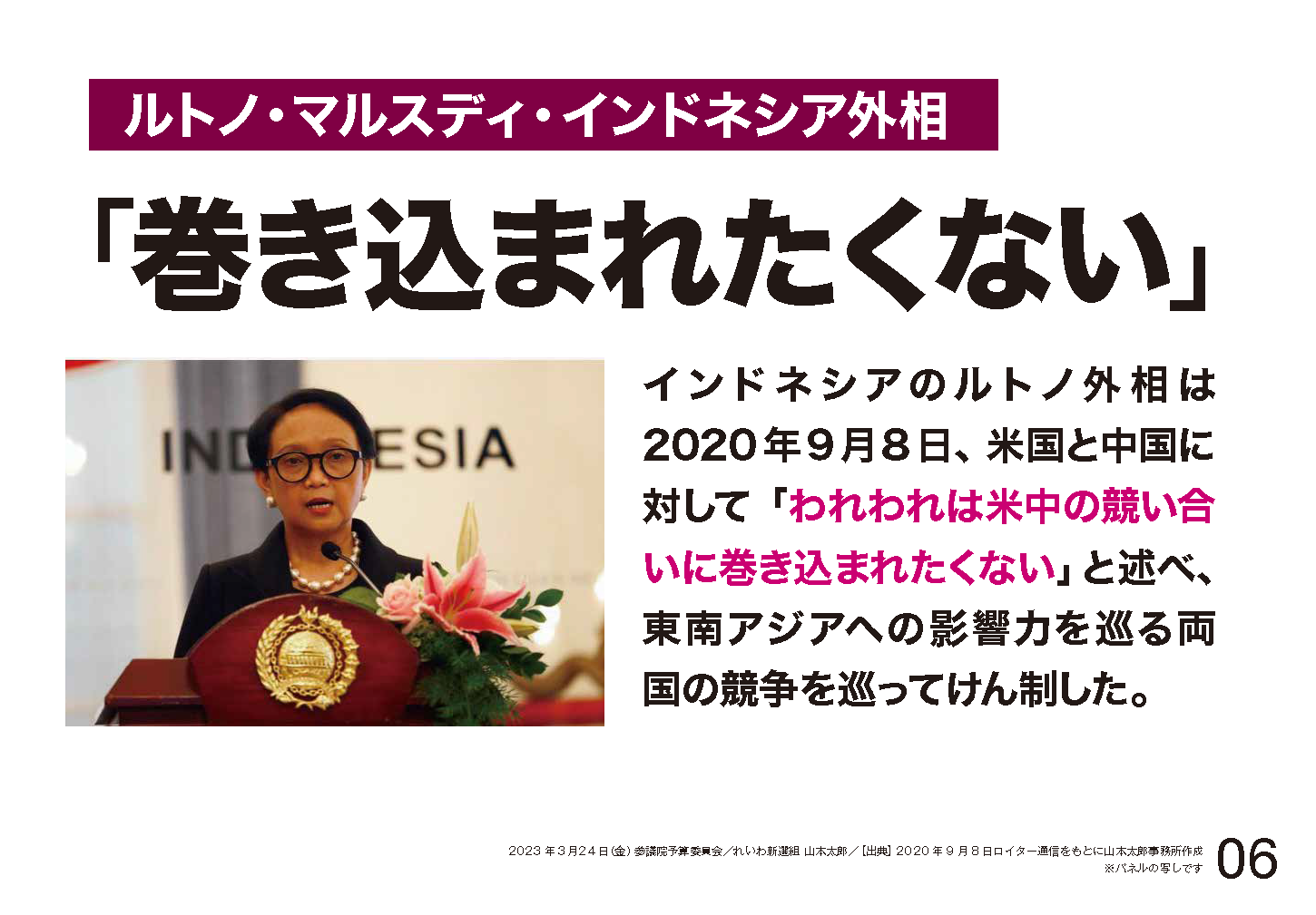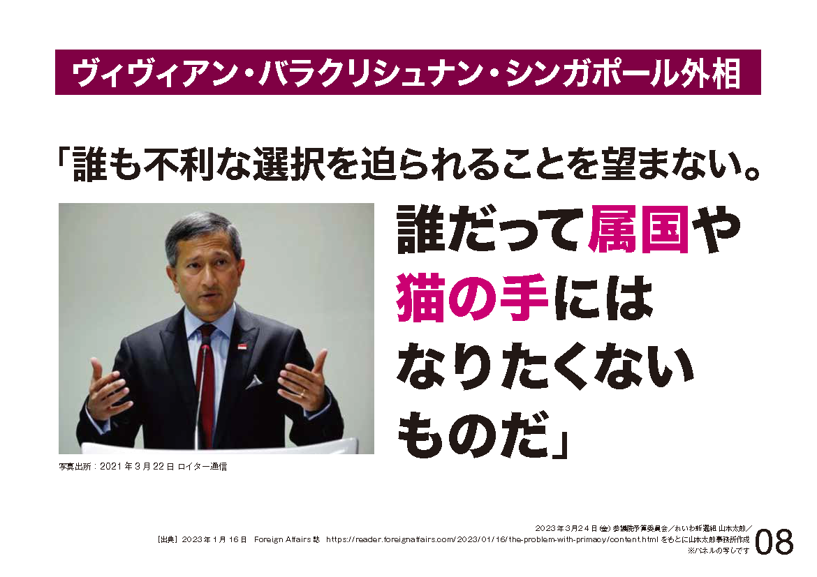 インドネシア外相、巻き込まれたくない。フィリピンの国防相、私が心配してるのは、欲してもいない戦争に巻き込まれることだ。シンガポールの外相、誰も不利な選択を迫られることを望まない、誰だって属国や猫の手にはなりたくないものだ。オーストラリアの国防相、二者択一を迫るようなことはするなと警告。