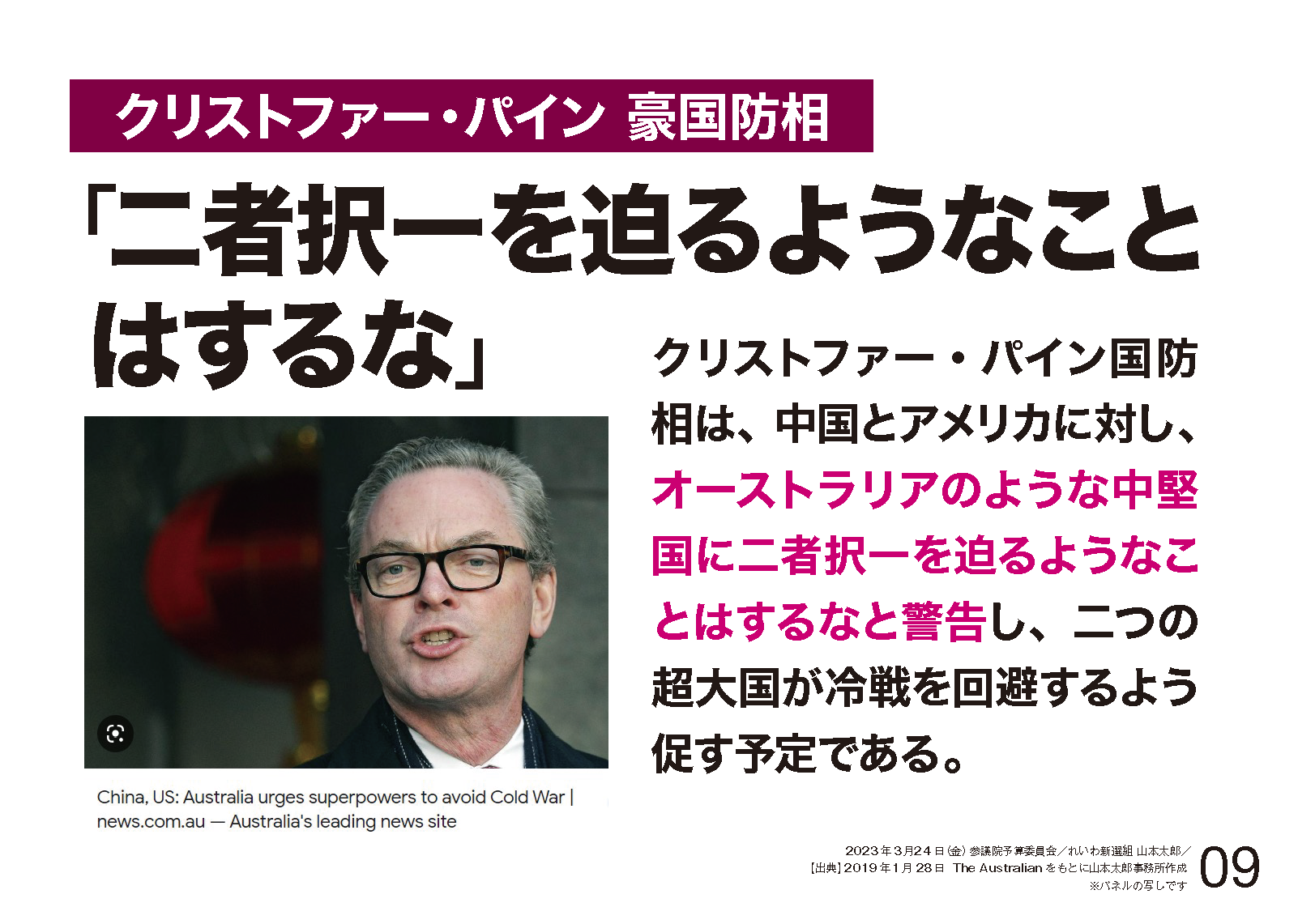 昨年8月、そのペロシさんが台湾を訪問、蔡総統と会談をなさった。資料の③。台湾の大手新聞は、台湾情勢を緊迫させる、ペロシ個人のレガシーづくりと批判された。ペロシの行動は、過去25年間の中で最も高い位の米国政治家、それも超タカ派が台湾訪問をしたことになると。余りにも意味を持ち過ぎる訪問で、緊張の加速というのは避けられません。これは日本にとっても歓迎すべきものではないと。