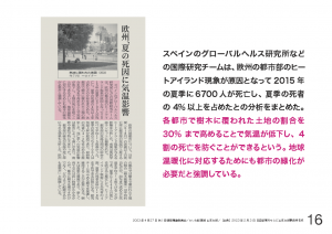 資料の⑪。スペイン・バルセロナの政策。26度程度のクーリングシェルターを設置し、95%の市民が自宅から徒歩10分以内にシェルターにたどり着けるよう配慮されている。これこそ本気の熱中症対策なんですね。