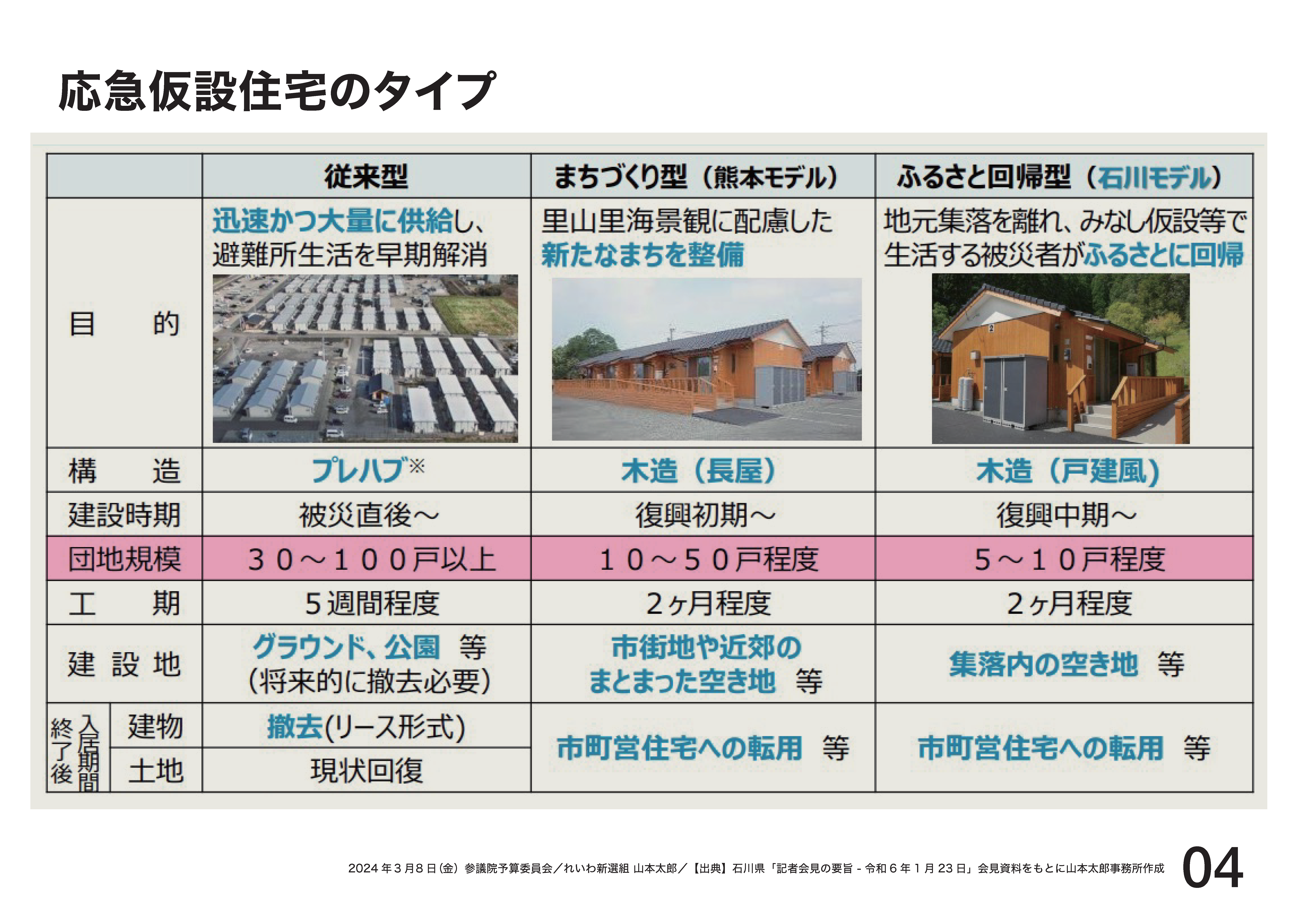 今回、仮設住宅は三種類。資料を御覧いただくと、1番左側、そちらが旧来型、旧来型の仮設。真ん中は熊本地震からの長屋タイプ。1番右、今回石川モデルとして推進されるふるさと回帰型。この建設時期は、復興中期、恐らく2年後目標と思われます。3つのタイプ、これを駆使して能登の再生を図るようです。