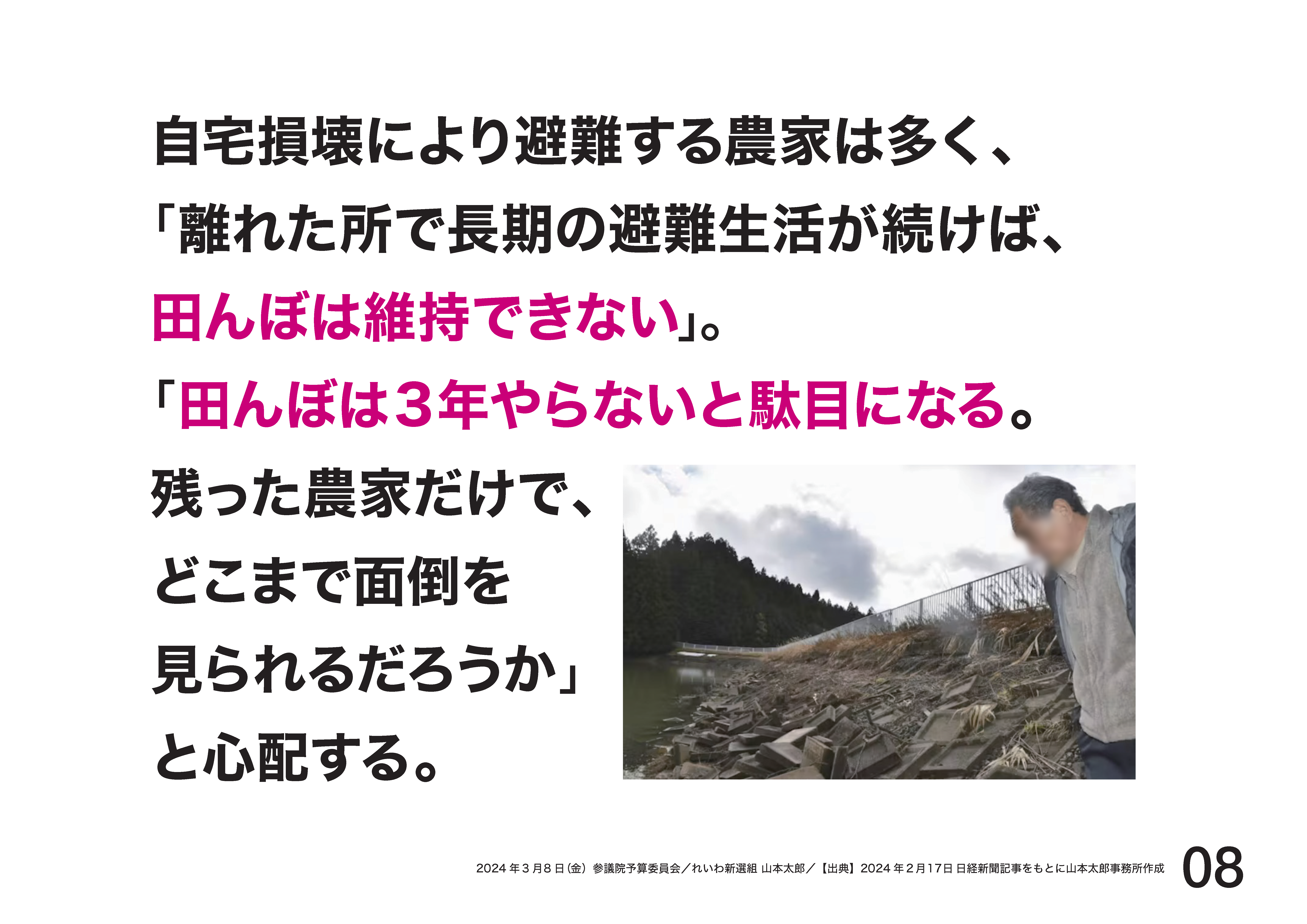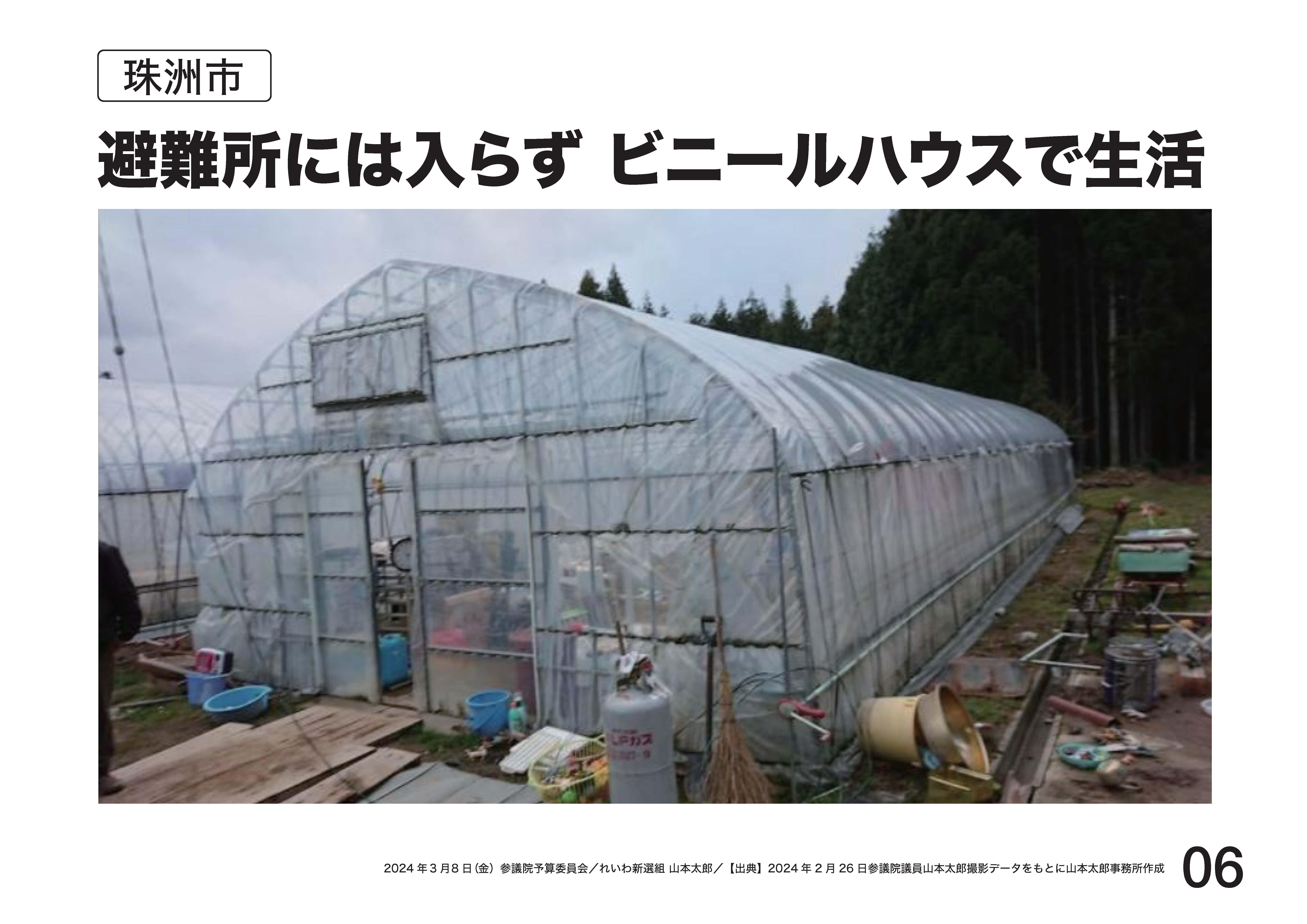 米作りをする3世代9人の家族。地震で家が倒壊、2人が家屋の下敷きに。近所の方にチェーンソーを持ってきてもらって、何とか救助。避難所ではなくて、今も、山の水をくみ、食器を洗ったり洗濯したり、自衛隊の給水を受けたり、ビニールハウスで生活をしています。子供もいるし、何より田んぼから離れることはできないから避難所には行けない、そうおっしゃいました。政府に今何を求めますか、そう聞くと、ここに仮設住宅を置いてほしい、集合型の仮設からは田んぼに通えないと。