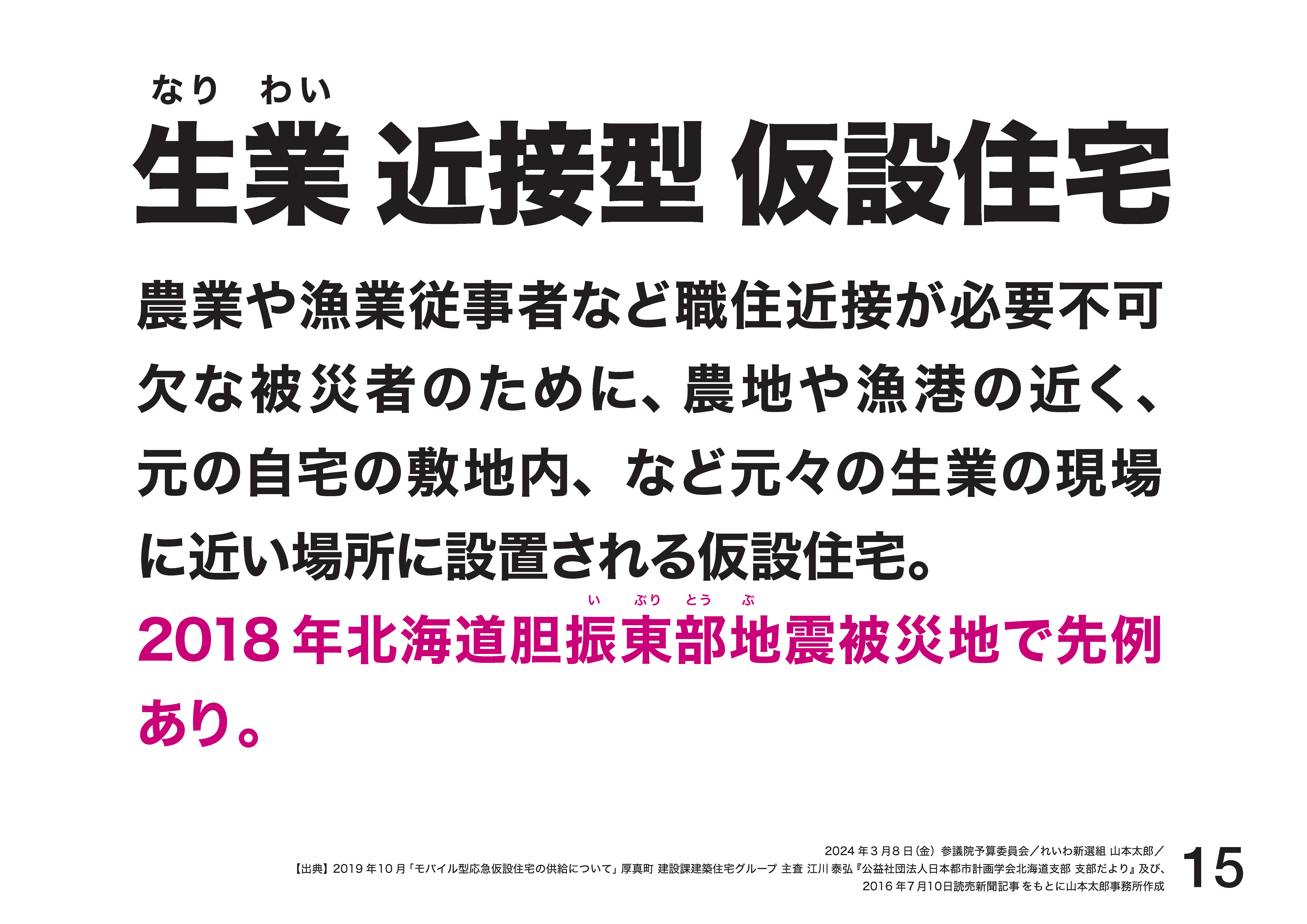 牛や動物から目が離せない酪農、いつでも田んぼ、畑の状況が確認できる環境が望ましい農業、一般的な仕事とは時間帯が違う漁業など、住まいとなりわいの場所が近接していることが望ましい方々のために、元の自宅の敷地や農地などに個別で仮設住宅を設置する。なりわい近接型仮設住宅の設置を速やかに行い、生産者を守ってほしいんです。
