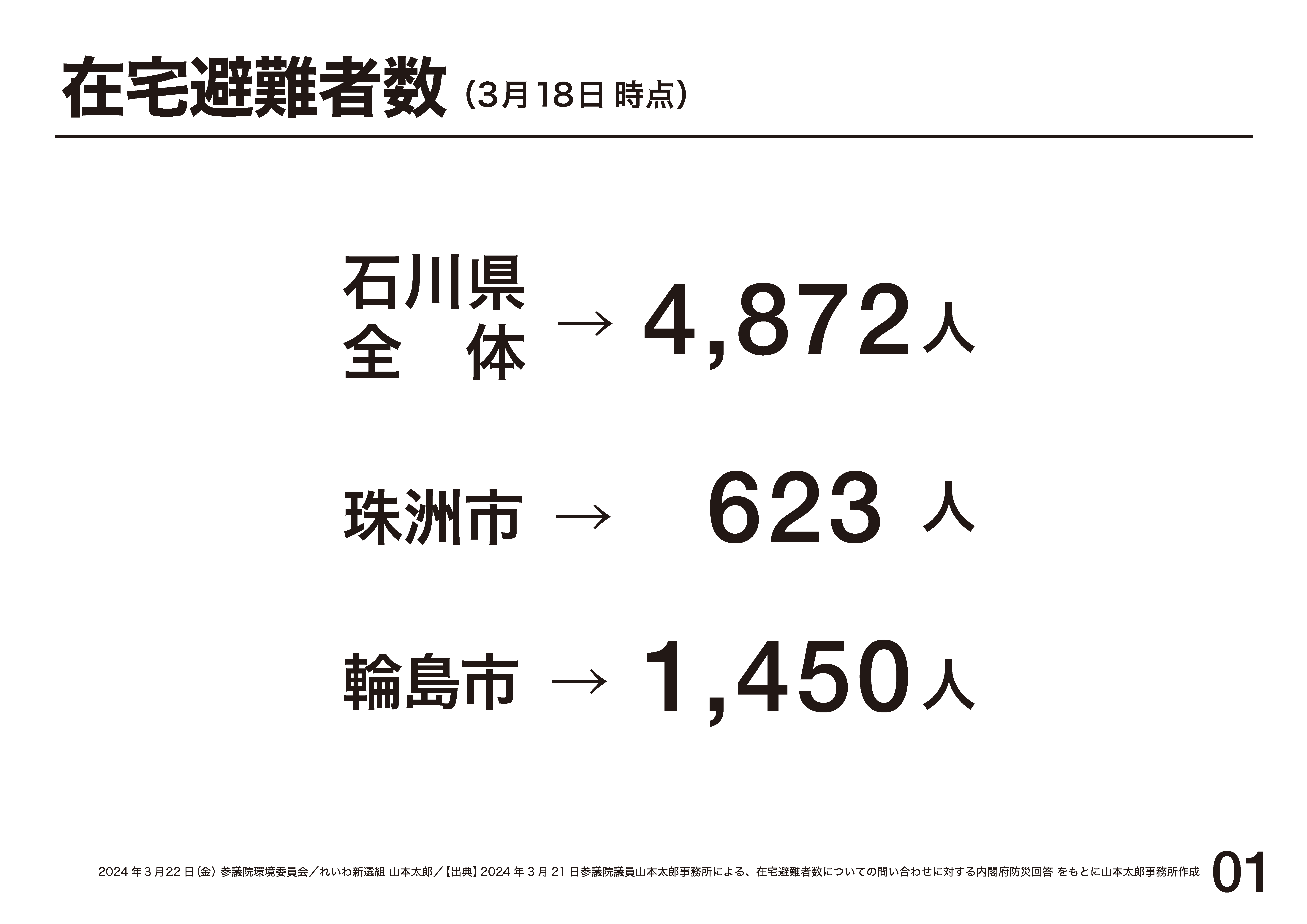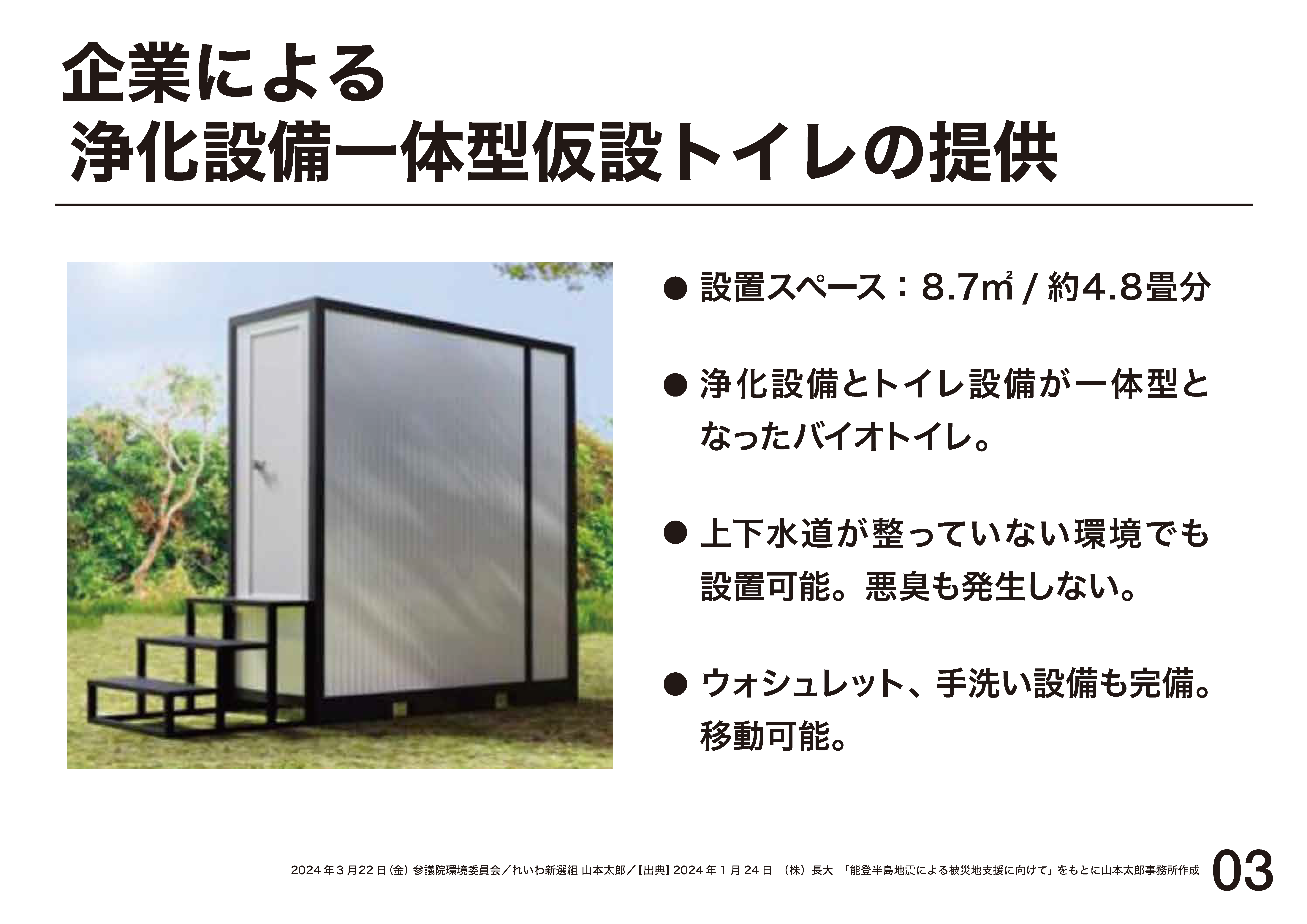 ○山本太郎君 現在、特に奥能登では上下水道の断水が続いていると。もちろん、浄化槽を使う世帯でも使用できない世帯が多く存在しているものと思われます。