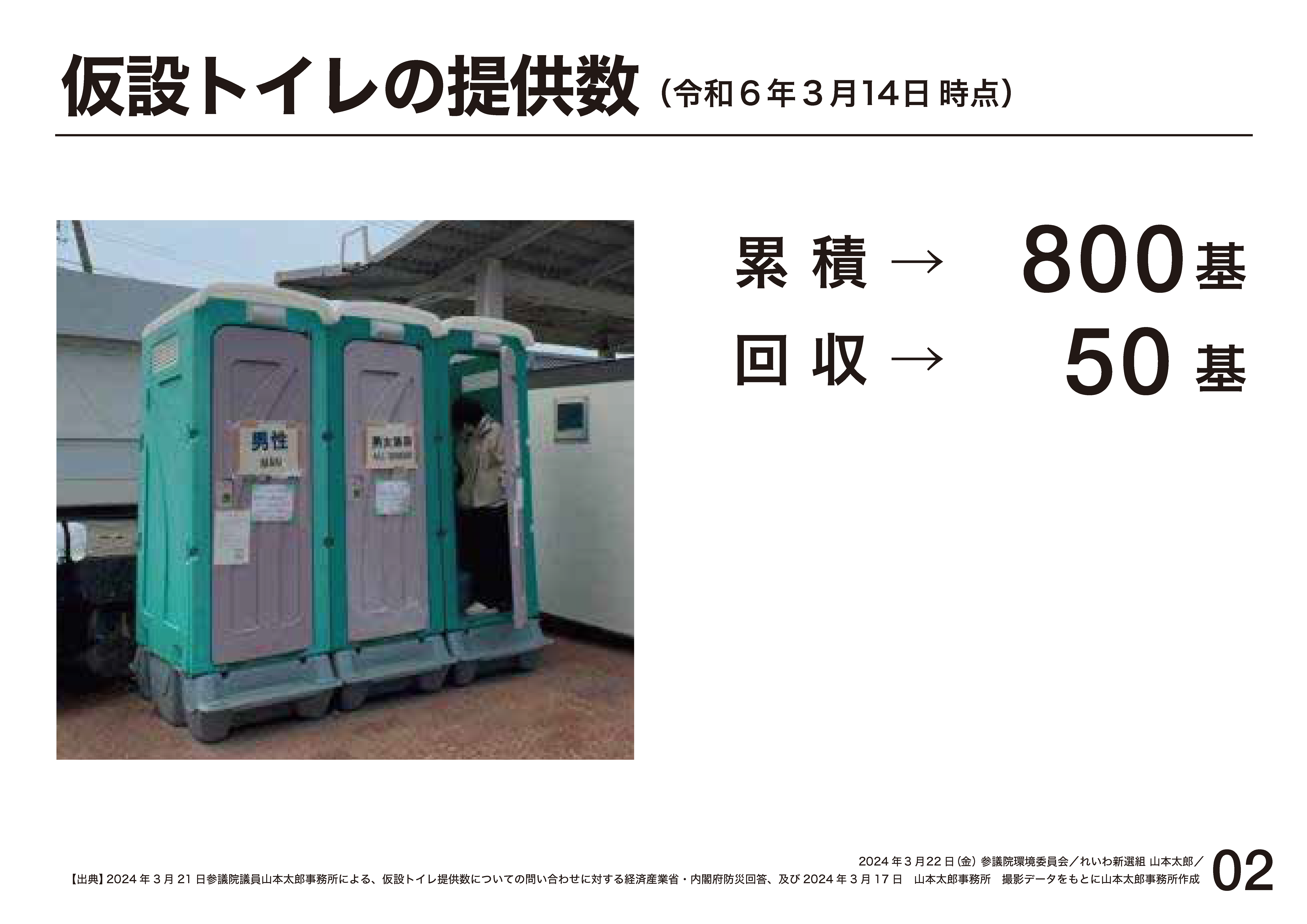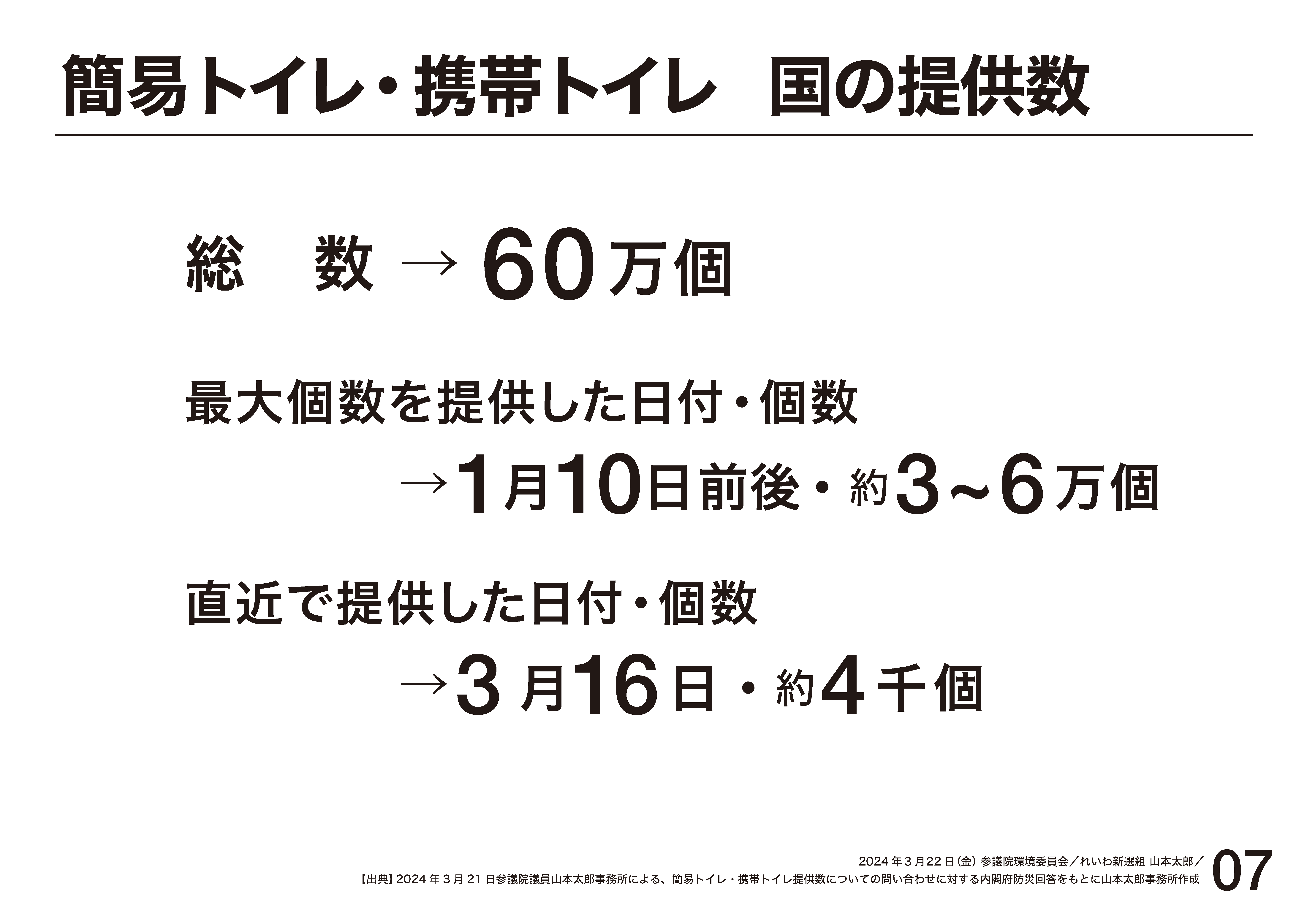 担当省庁の話では、発災から合計で約60万個を届けてきた。最大量を届けた時期、一番大量に納入した時期、現地にということですね、最大で、最大量を届けた時期としては1月10日前後、そのときには1日約3万個から約6万個。直近で届けた日は3月16日、ここは数が切り分けられたようです。直近で届けた日は3月16日で、携帯用トイレが約4000個。ここから分かるように、1月10日をピークにその後減り続けているんです。直近3月16日で4000個しかないですから。4000箱じゃないんですよ、これ。4000個なんです。これ、減らしている場合じゃないんですね。増やさないと困るんです。