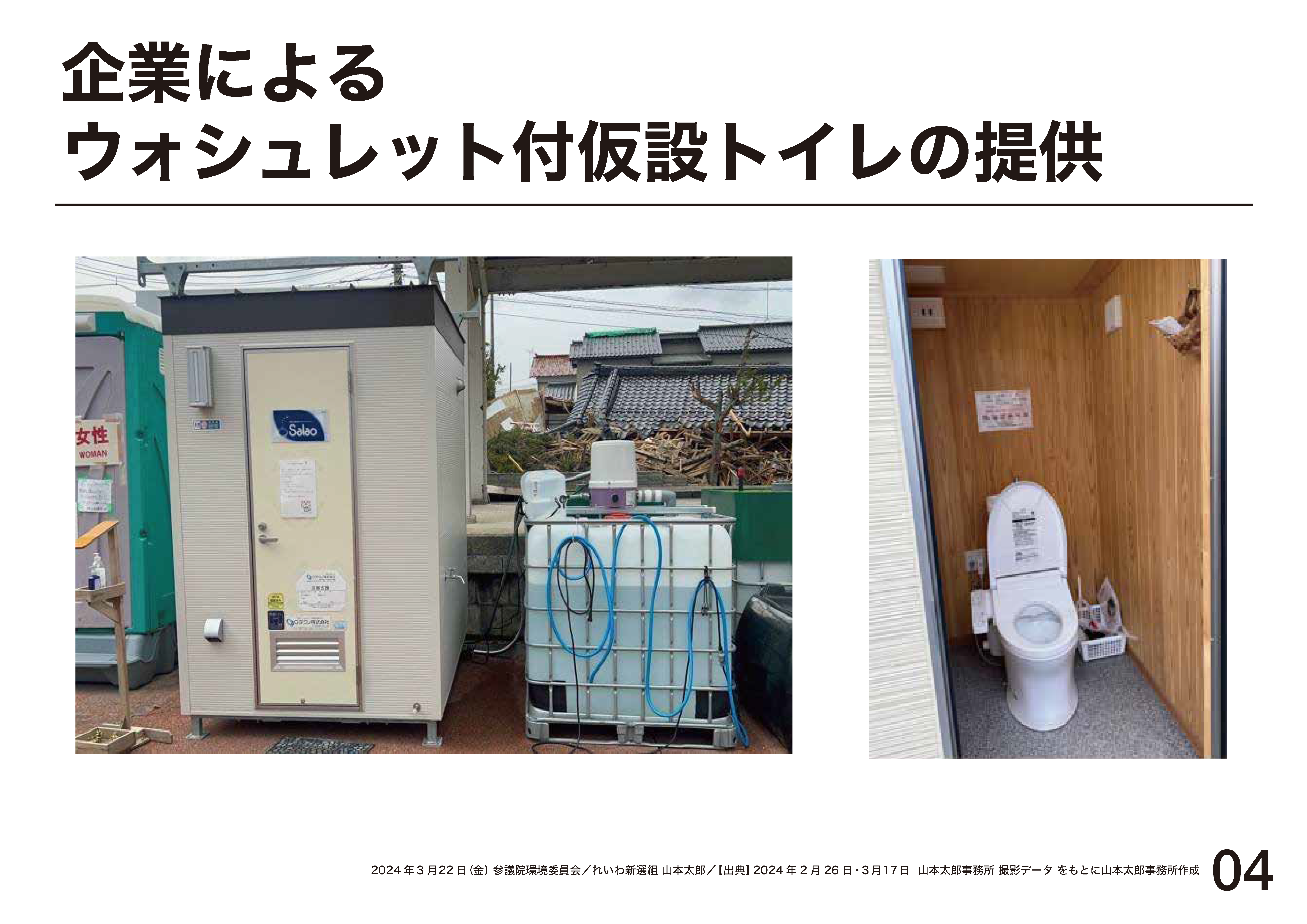 一方で、在宅避難者が住まう地区、集落、その一角などに設置されて誰でも使えるという仮設トイレはほとんど見たことがないんですね。私、4回ほどお邪魔していますけれども、そういうケースを余り見たことがないんです、ほとんど。今一番ニーズがあるが届いていない支援、これ、在宅避難者の自宅近くにあるトイレということなんですね。
