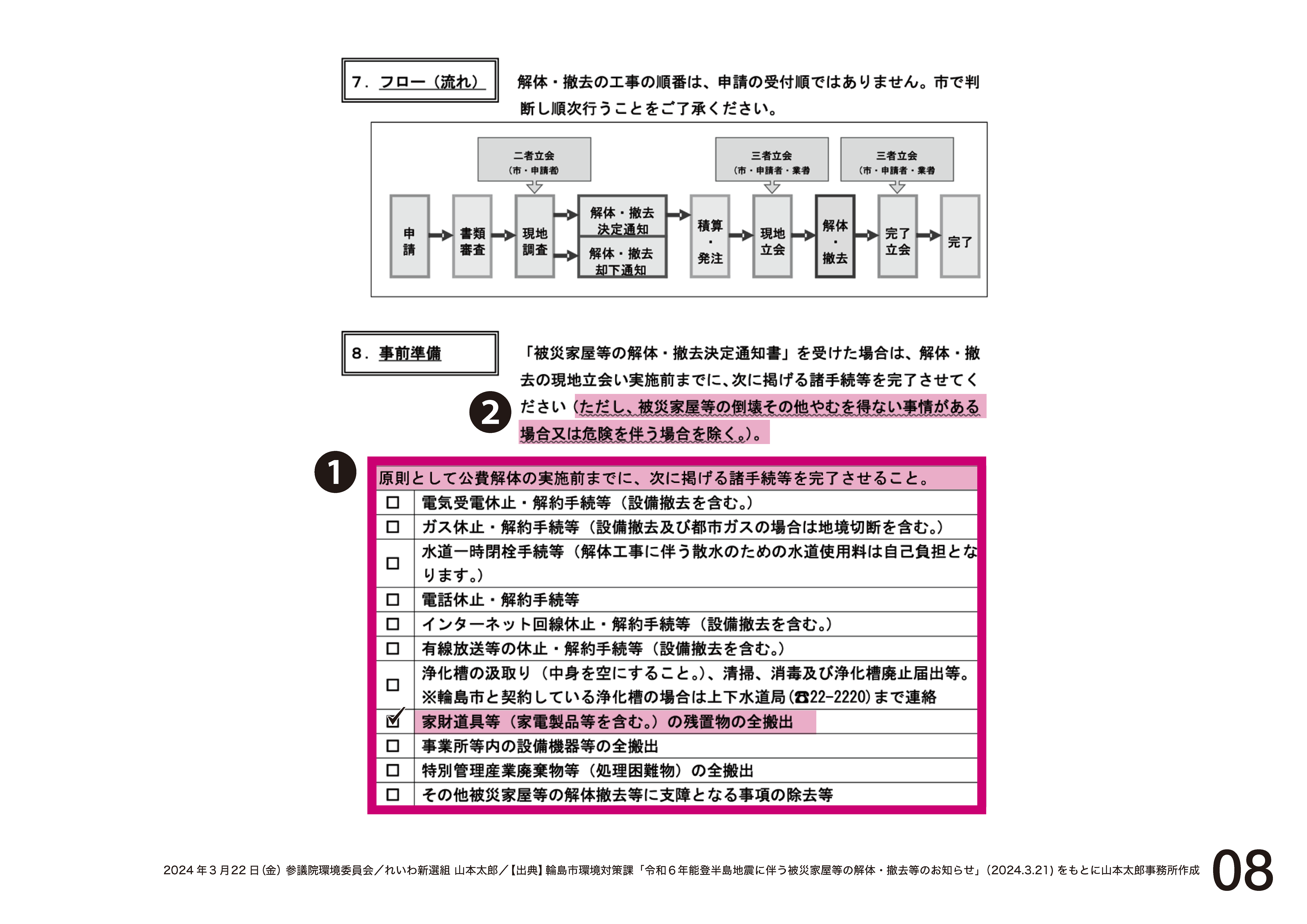 資料の⑧、これ輪島市における公費解体の説明なんですけれども、ルールが書かれているんです。
