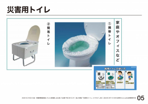 携帯トイレ、災害用トイレについて。袋、袋状のものを便器又はバケツなどに固定をする、そして用を足した後に汚物全体に凝固剤を振りかけて、用を足した後、袋の口をしっかりと結び廃棄すると、このようなものが携帯トイレと言われているものなんですけれども、在宅避難の方々は多くが家のトイレを使えない状況、そこでこの携帯トイレを使うという方々が多いんですね。この携帯トイレを使っている、使っていないの線引きというものを考えたときに、携帯トイレが手に入ったか、手に入らなかった差というのが非常に大きいんです。