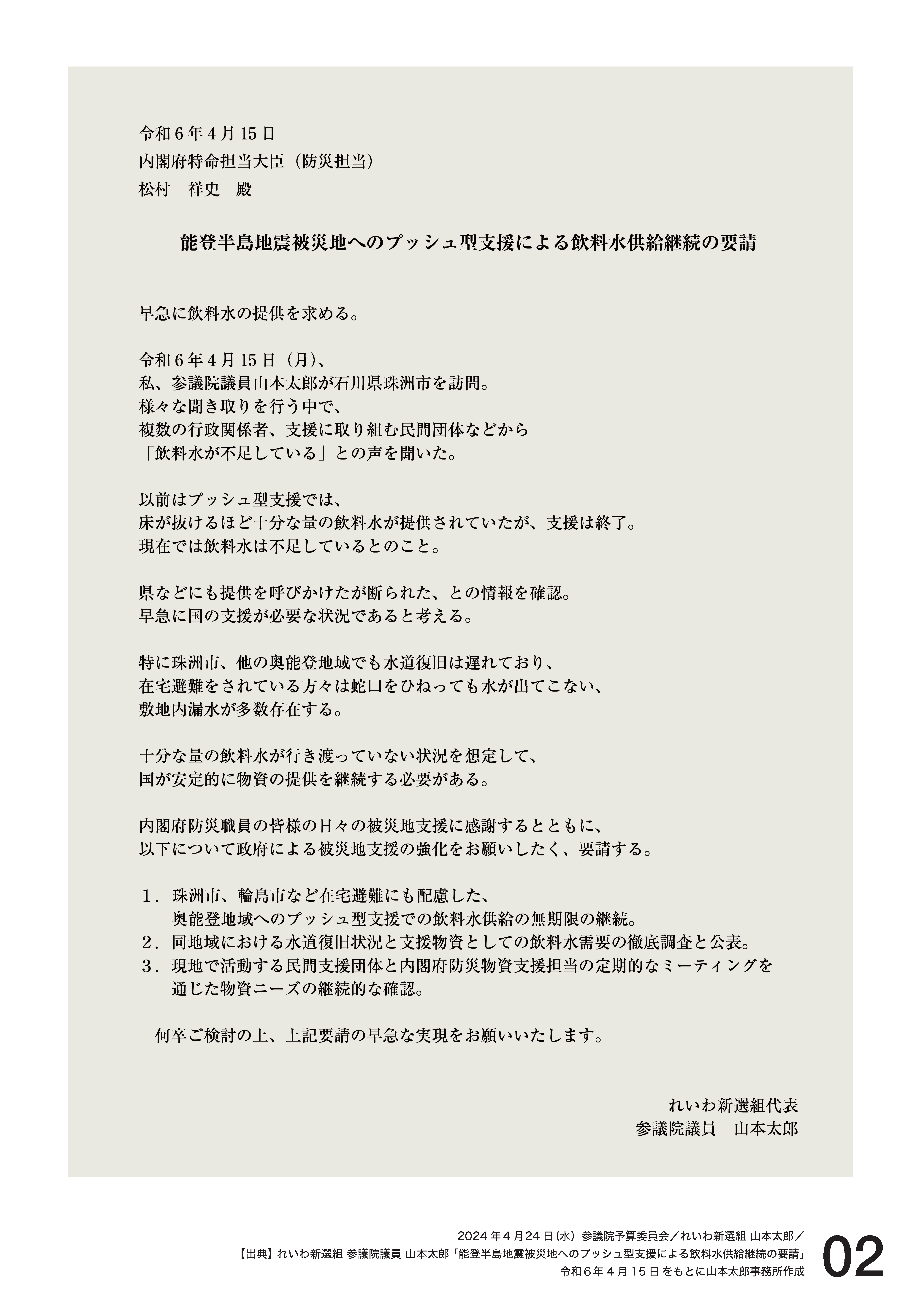 現場から私が直接内閣府防災に電話、至急飲み水を提供し、無期限で供給することなどを要望書も併せてその日のうちに提出。