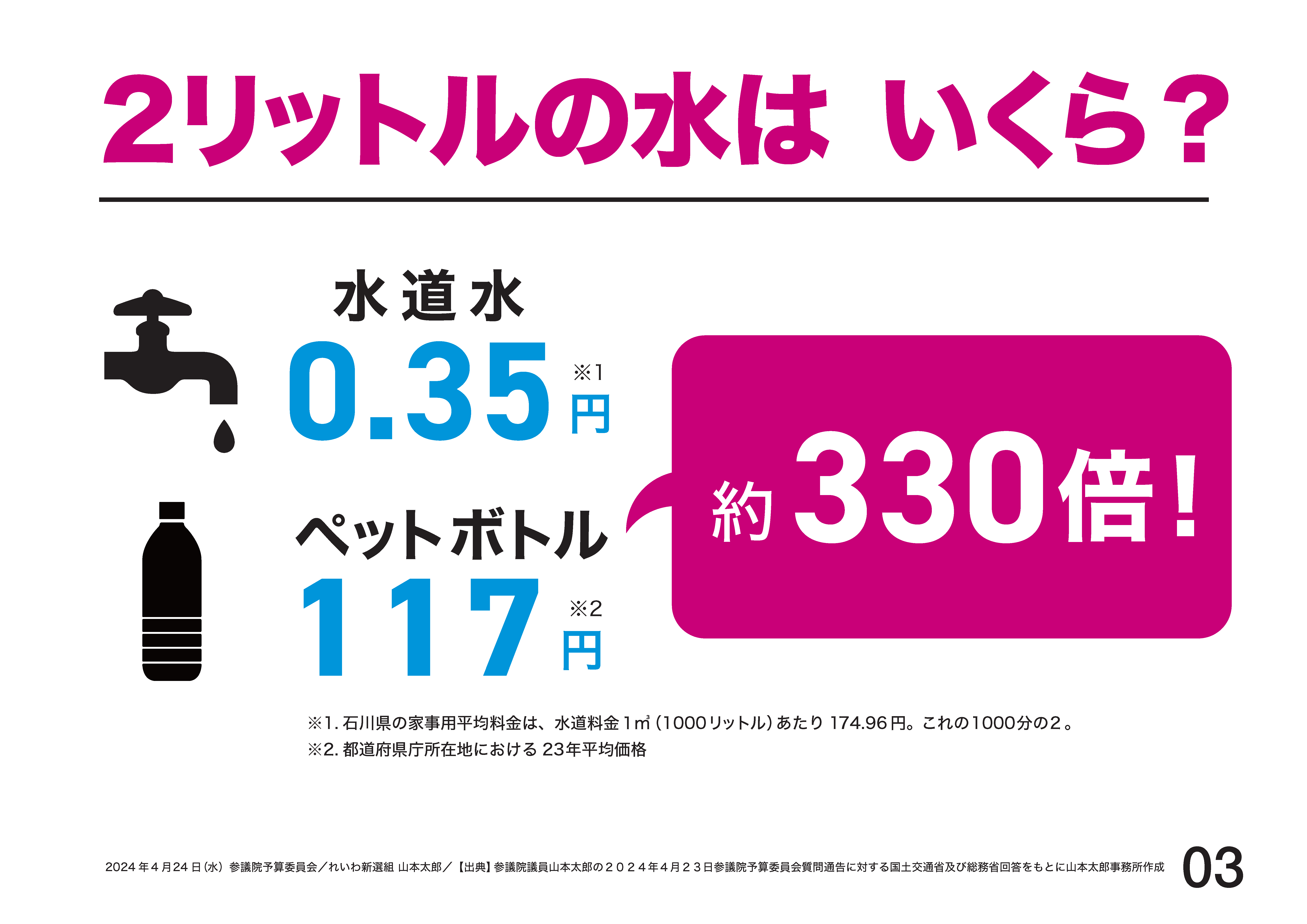 水道料金を2リットル分にすると約0.35円。一方、総務省小売物価統計調査では、2リットルのミネラルウオーター、1本117円。値段にして約330倍。その違いです。