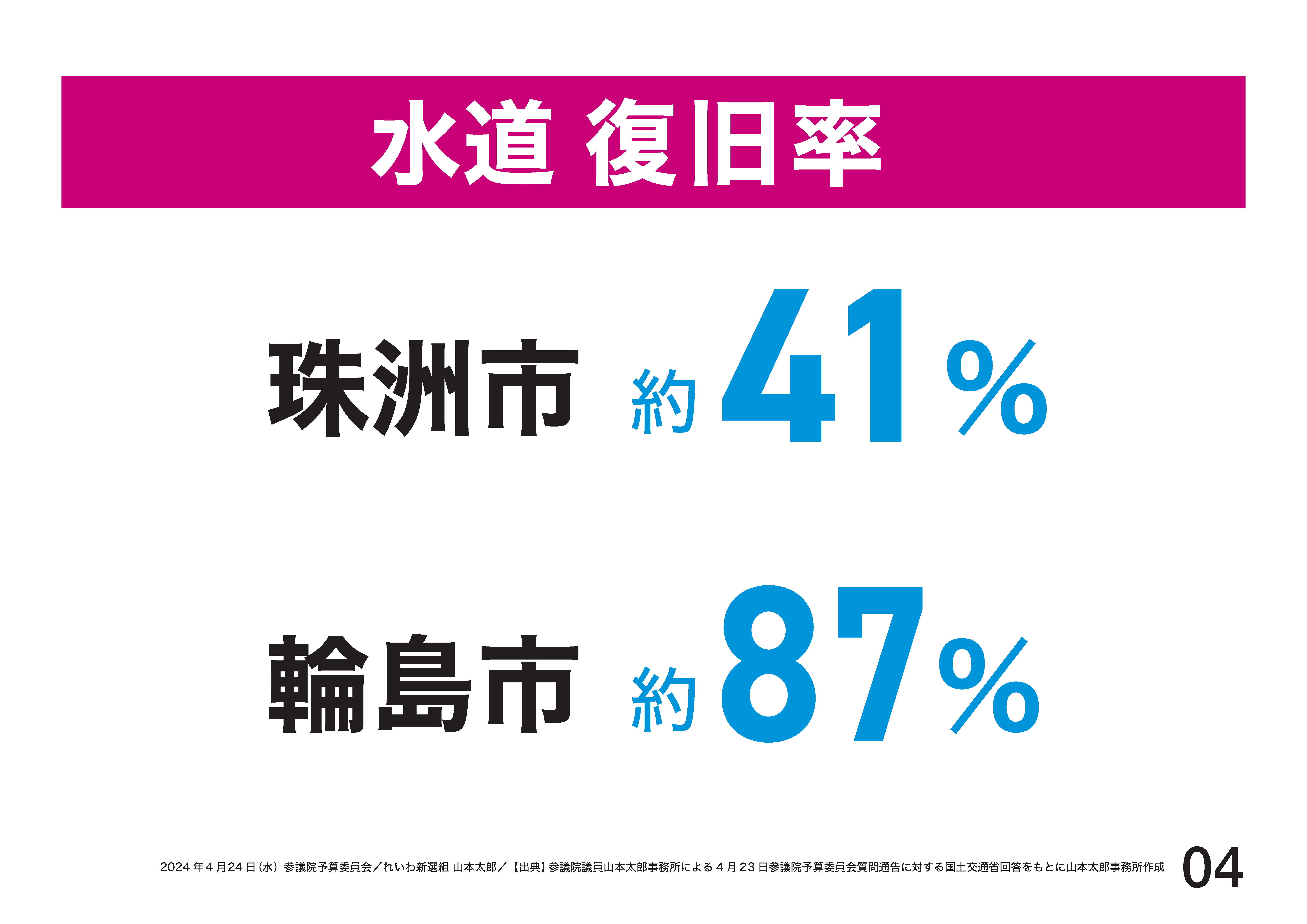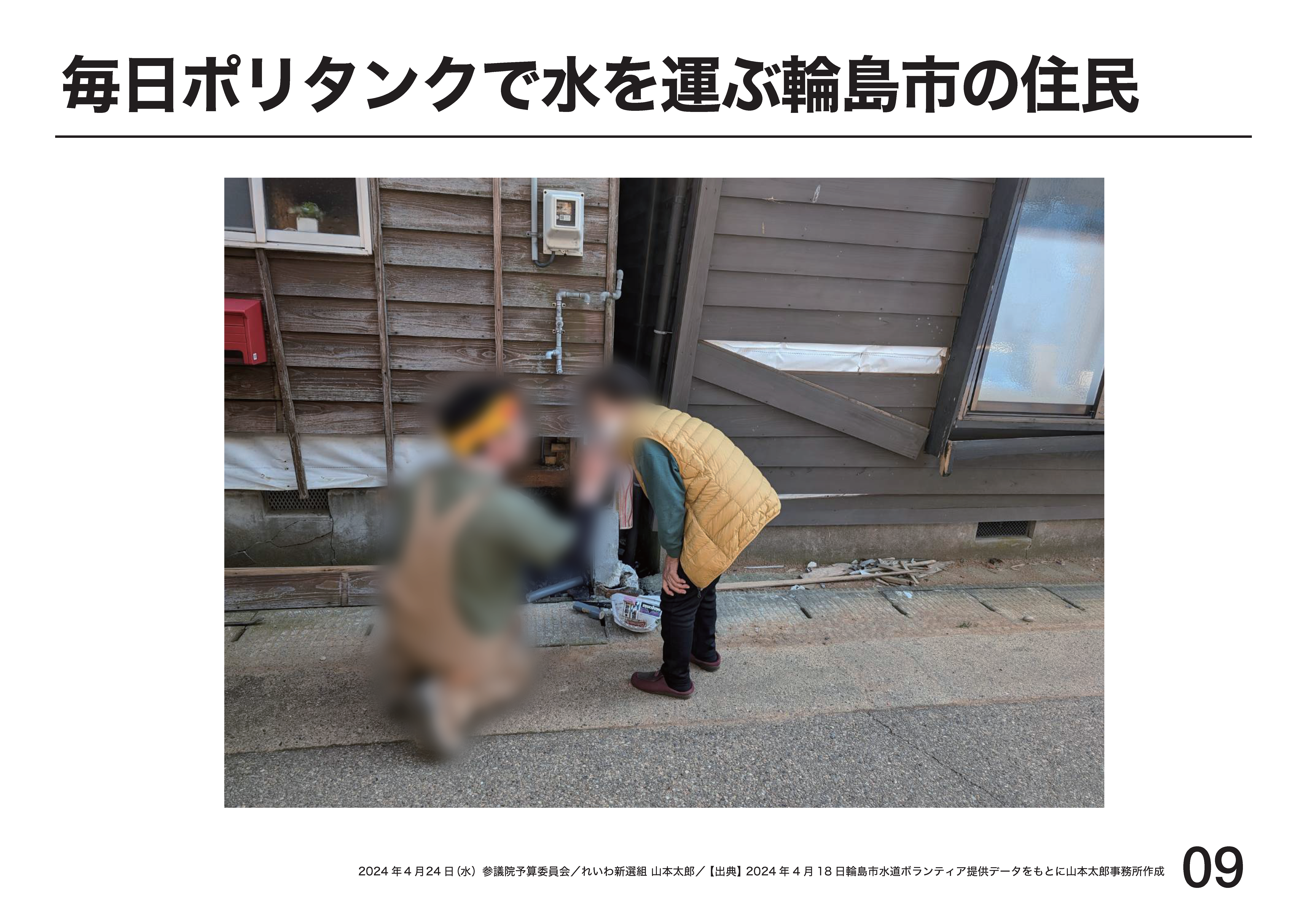 現在の水道の復旧率、珠洲市41%、輪島市87%。この復旧率とは、家の蛇口から水が出る割合じゃない、家の敷地の外までは水が来ているという意味。一方、そこから水を敷地内に引き込む管が破損、いわゆる宅地内漏水が圧倒的多数です。そこを直すのは被災者の自腹。職人は圧倒的に足りていません。