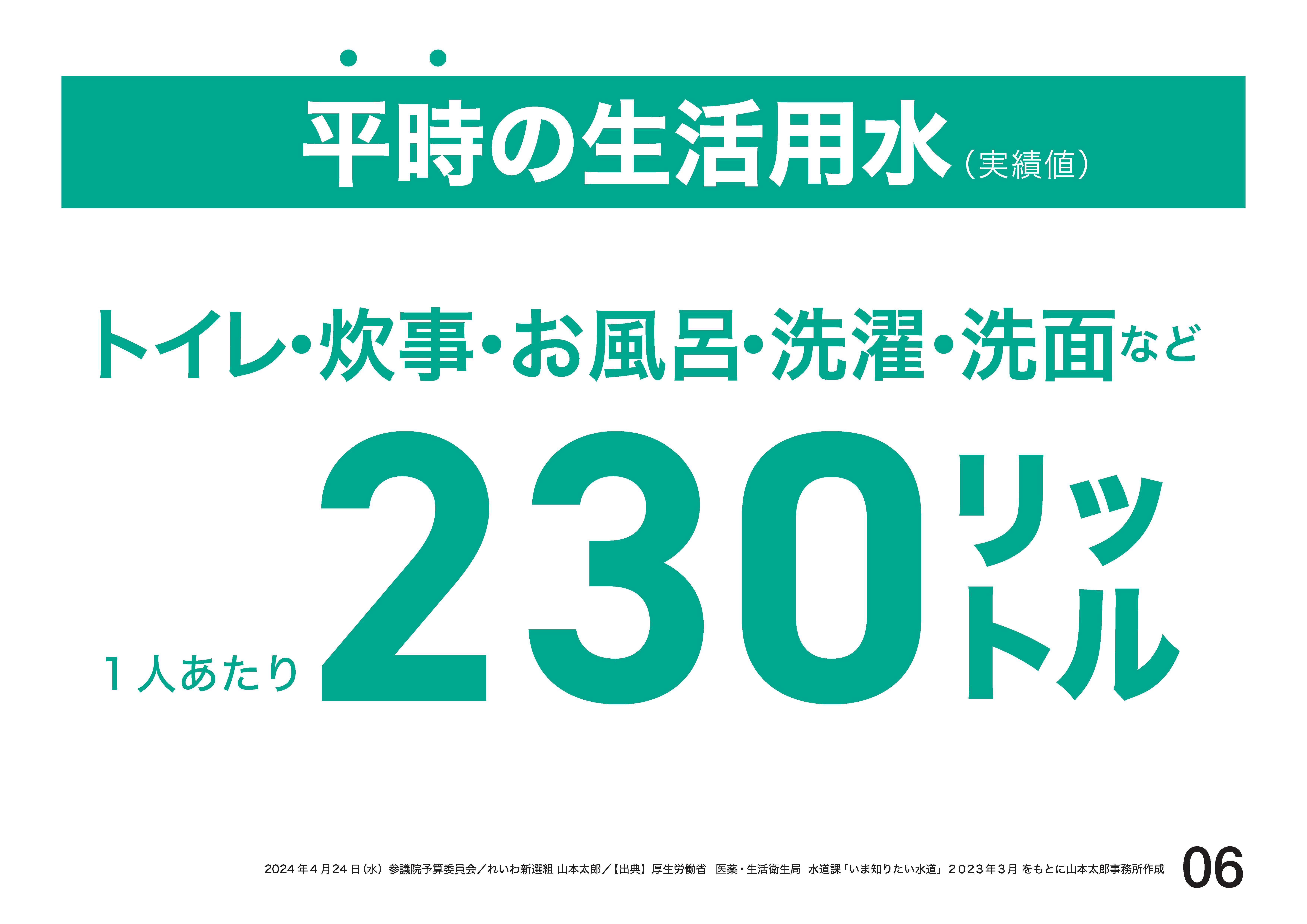 生活用水も足りていません。一般的に生活用水は1人1日当たり230リットル使う。災害時に必要な水について、厚労省のガイドラインでは、災害2週間後から1人当たり1日250リットル使えることが好ましい、目標とされている。ちなみに、4月中旬時点、珠洲市での給水支援は1世帯当たり20リットルまでのルール。