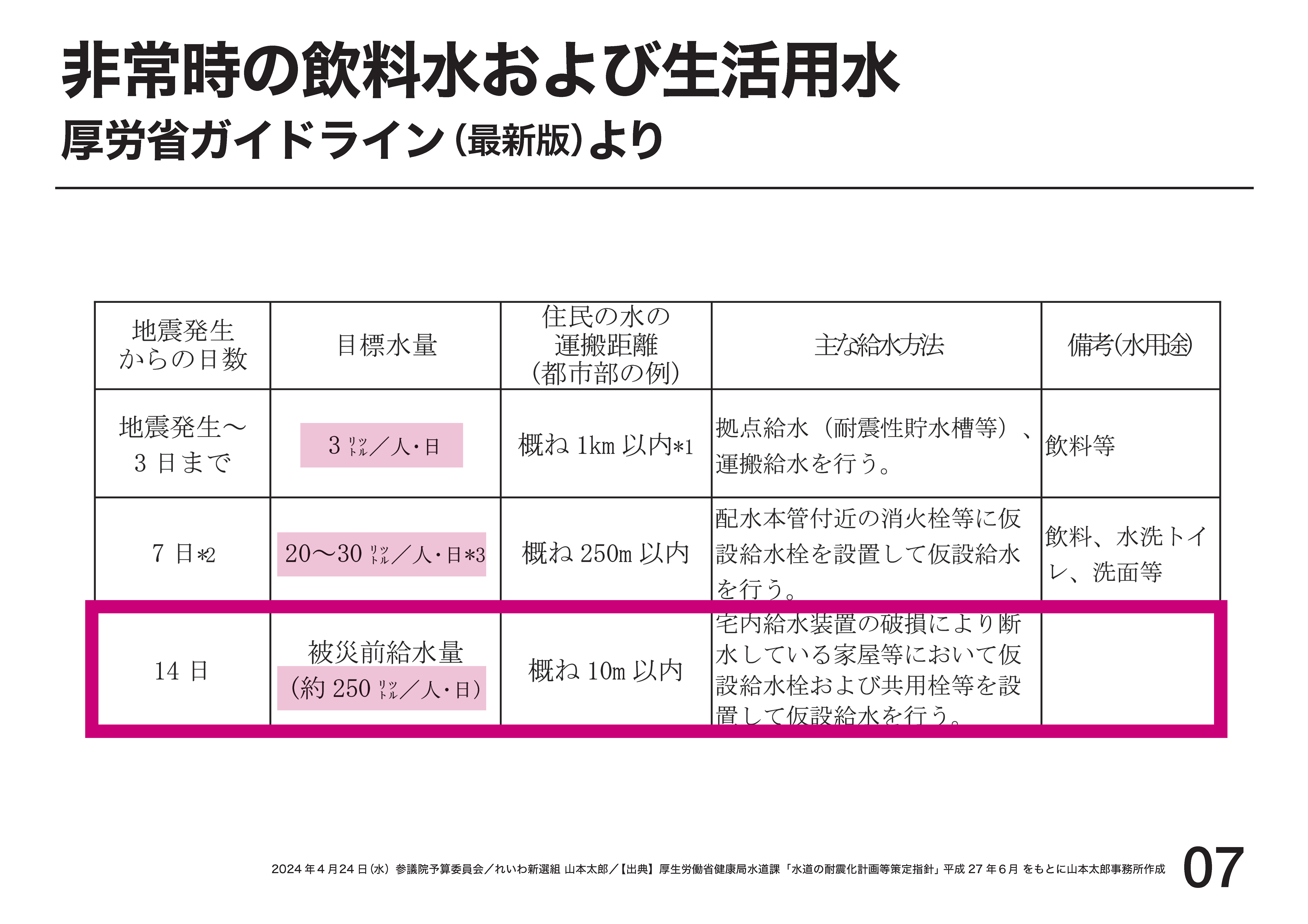 避難生活では、小さな紙コップに水を150ミリリットルほど入れ、歯磨き後は一口の水で口をゆすぎ、余ったカップ内の水で歯ブラシを洗う。水が必要なのは、飲むことだけではなく、トイレを流す、食器を洗う、調理する、手を洗う、お風呂に入るなど、生活の全ての場面で水を使用しなければ、当たり前の生活なんて送れません。そのために、高齢者ですら給水場に行き、毎日20リットルの水を運ばなければならない。毎日水を運ぶ作業で、腕や手首を痛める方も大勢いらっしゃる。復旧が見えない日々に疲弊し、絶望し、生きる努力を、給水にいそしむことも諦めた高齢者も多くいると聞きます。生活するための最低限の資源さえそろっていない上に、飲料水の支給も足りないという現状。