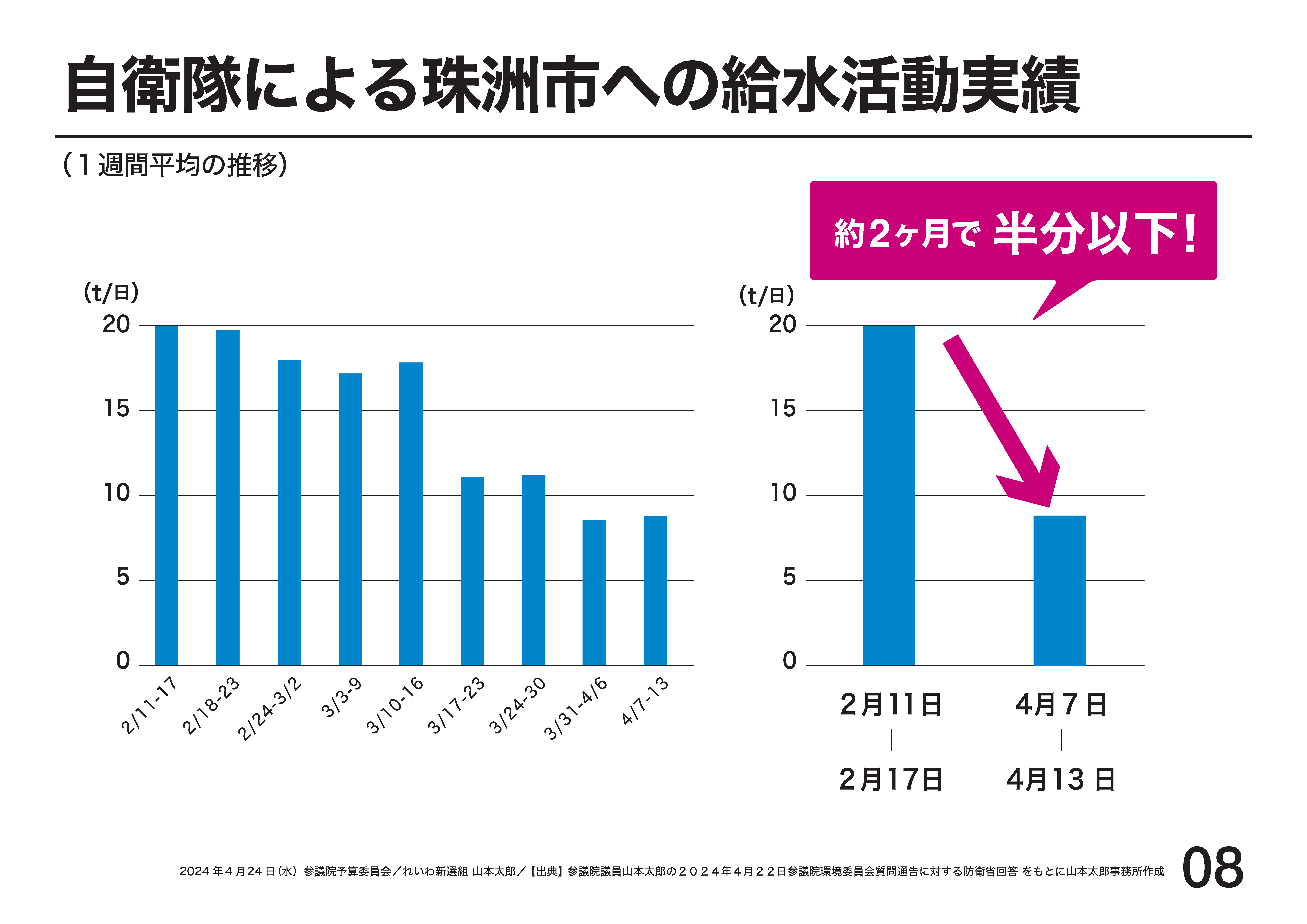 こうした復旧の進捗によって市街地や集落での給水ポイントは増加しており、19台体制でも生活用水の需要に見合う効果的な給水活動が行われていると報告を受けておりますが、いずれにせよ、現状については県ともしっかりと意思疎通を図りながら、国として必要な対応を考えてまいります。