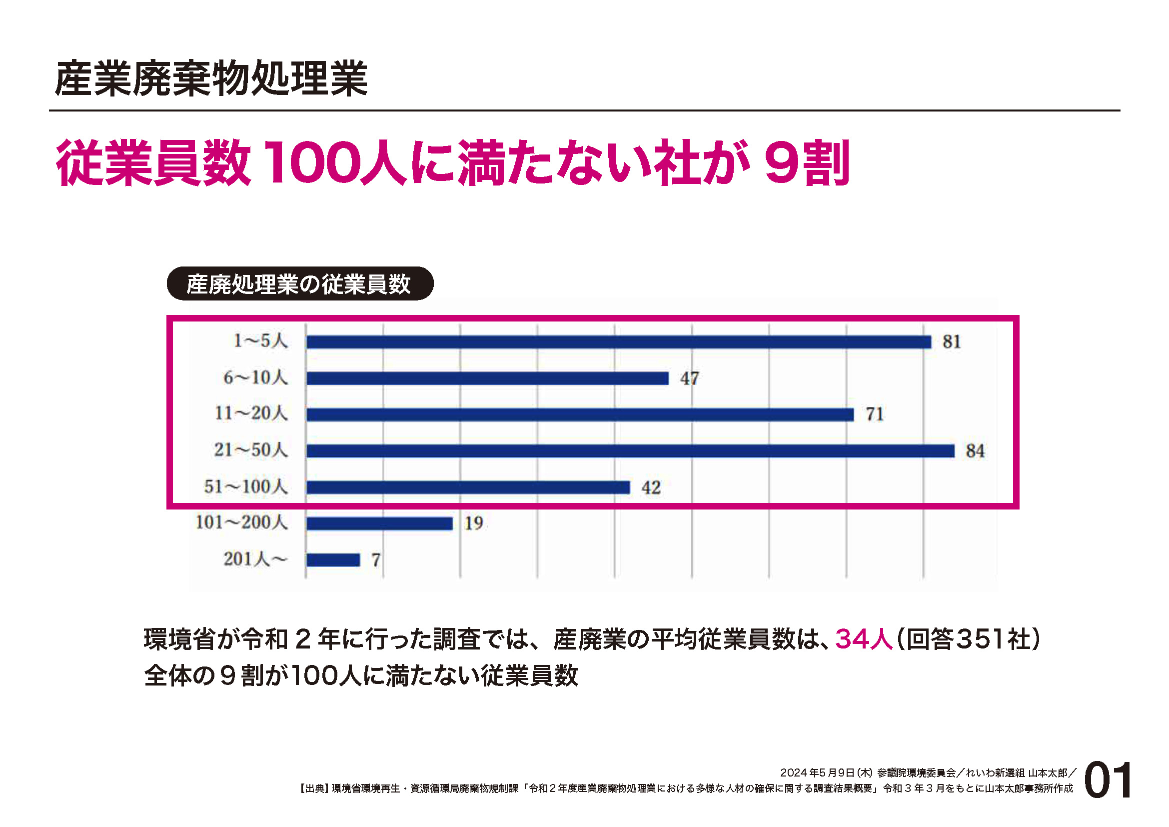 環境省2020年調査では、産業廃棄物処理業の平均従業員数は34人、全体の9割が100人に満たない従業員数。