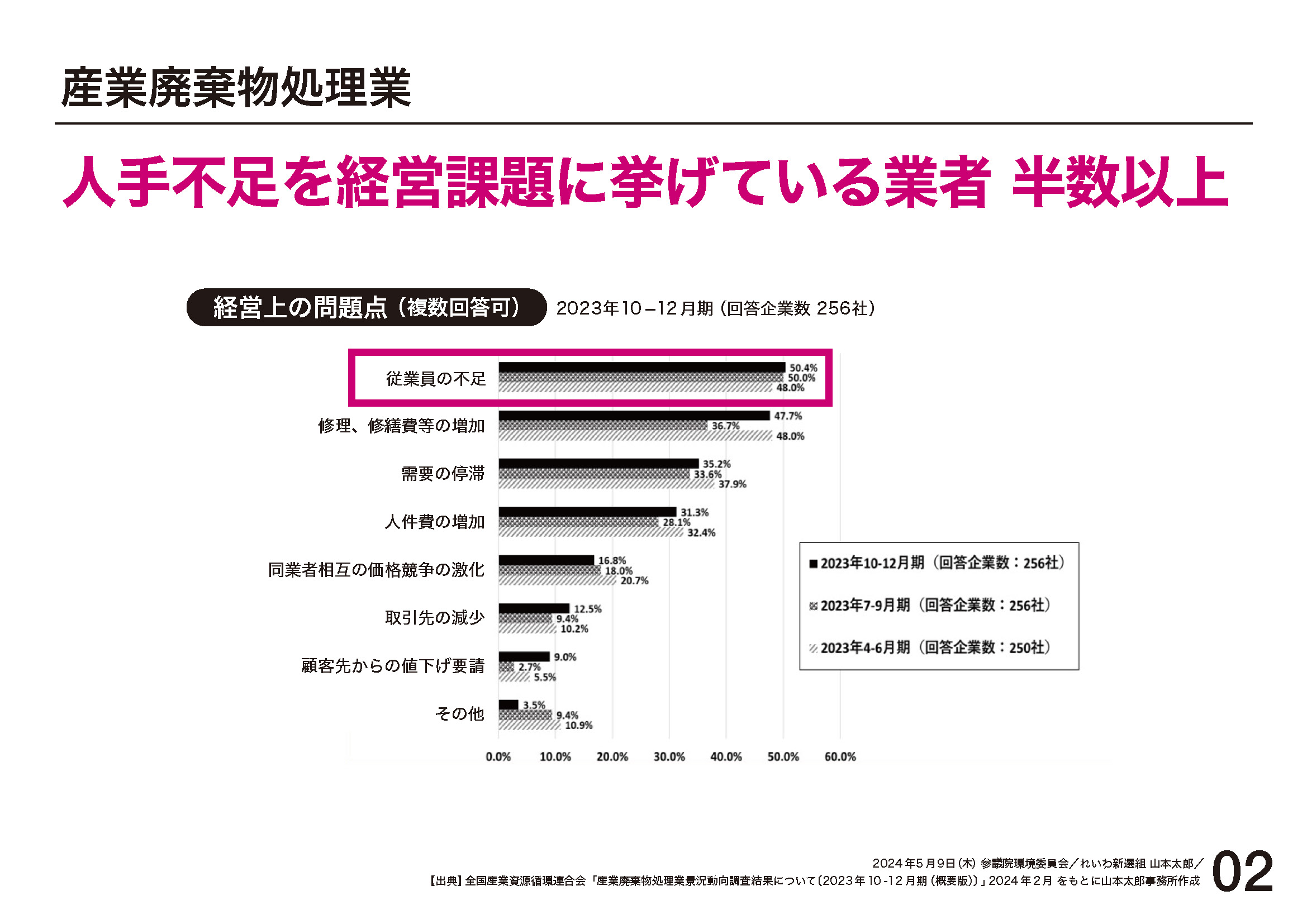 また、人手不足を経営課題に挙げている業者は全体の半数以上に及び、業界全体として人材確保は深刻な課題となっていると。
