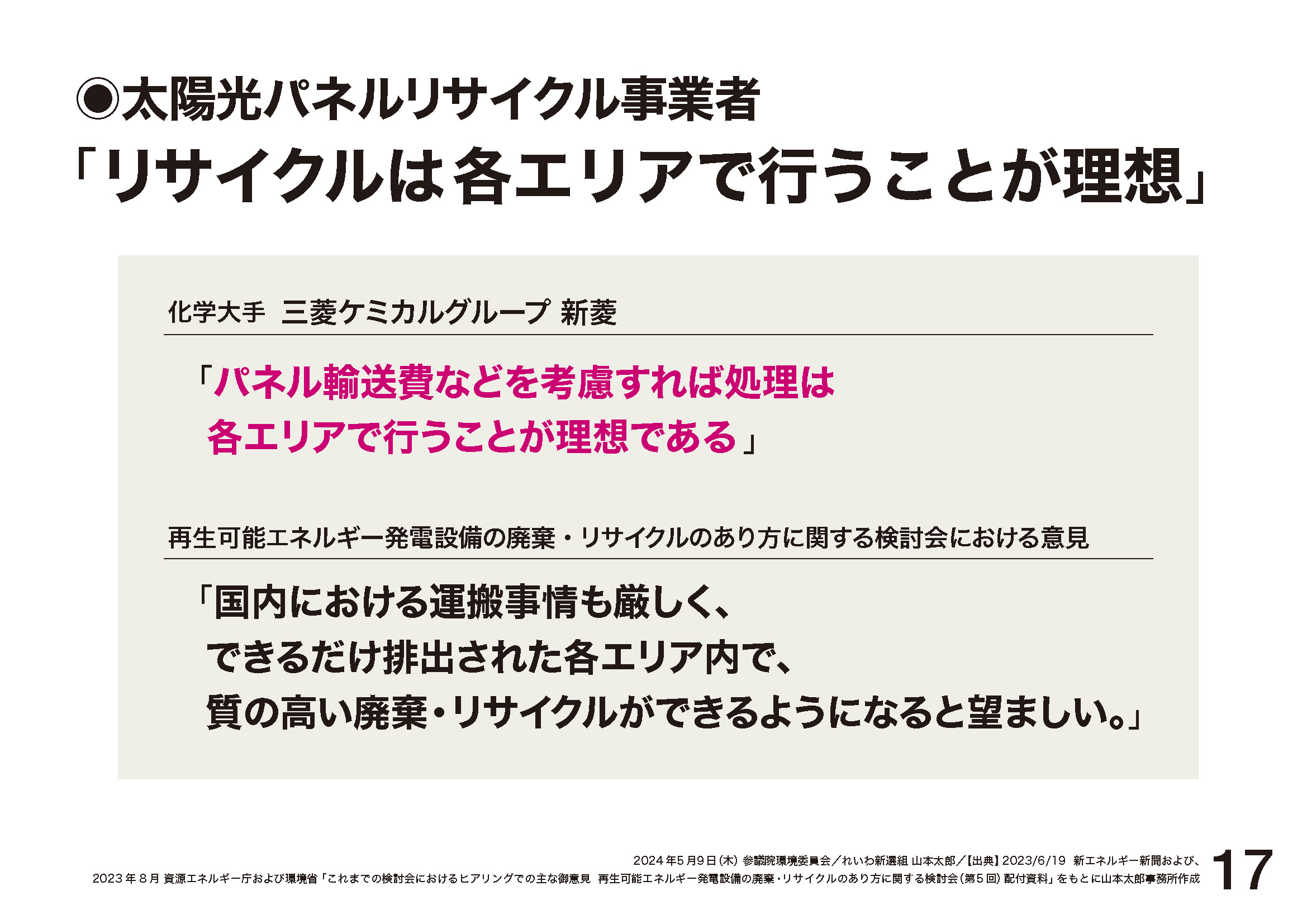 さらに、化学大手の三菱ケミカルグループ、新菱は、パネル輸送費などを考慮すれば処理は各エリアで行うことが理想であると指摘。