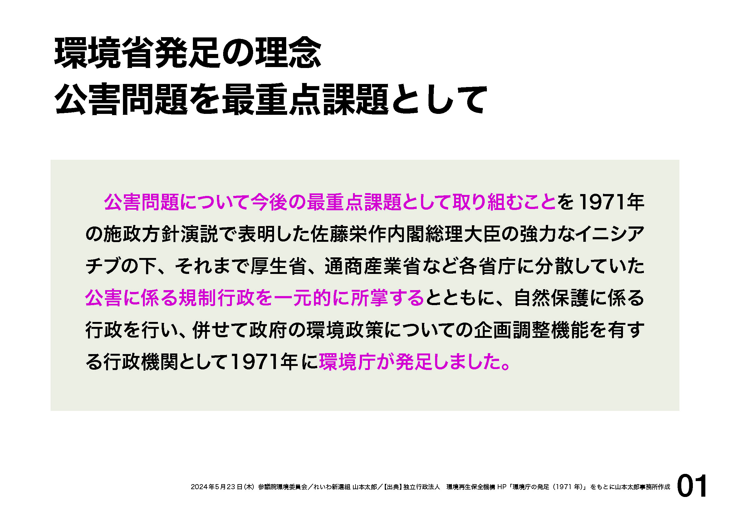 独立行政法人環境再生保全機構ホームページ、環境庁の発足、1971年。公害問題について今後の最重点課題として取り組むことを1971年の施政方針演説で表明した佐藤栄作内閣総理大臣の強力なイニシアチブの下、それまで厚生省、通産省など各省庁に分散していた公害に係る規制行政を一元的に所掌するとともに、自然保護に係る行政を行い、あわせて政府の環境政策についての企画調整機能を有する行政機関として1971年に環境省の前身である環境庁が発足しましたと。