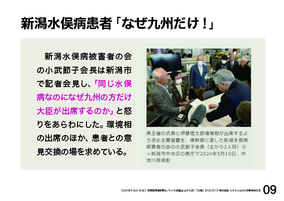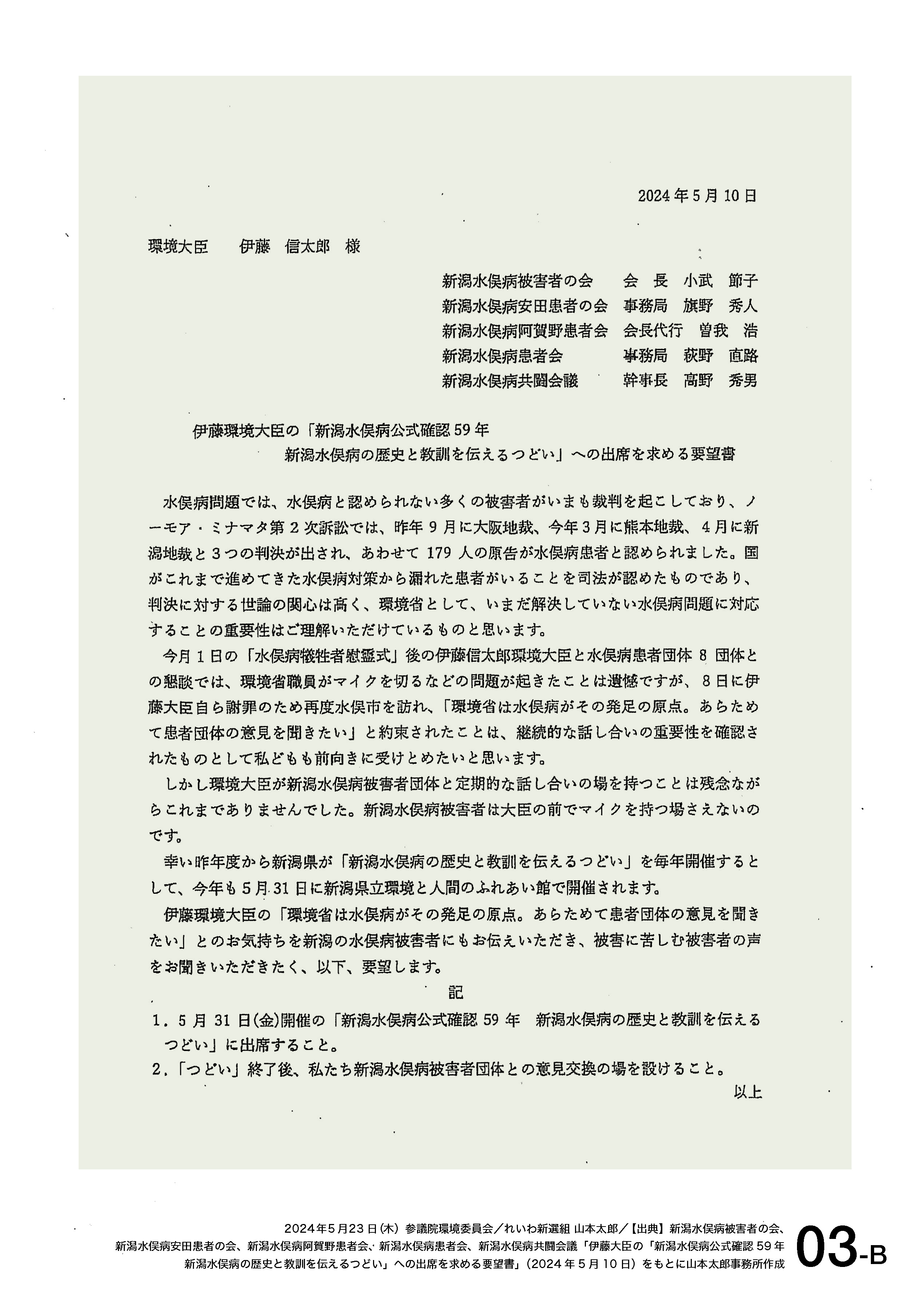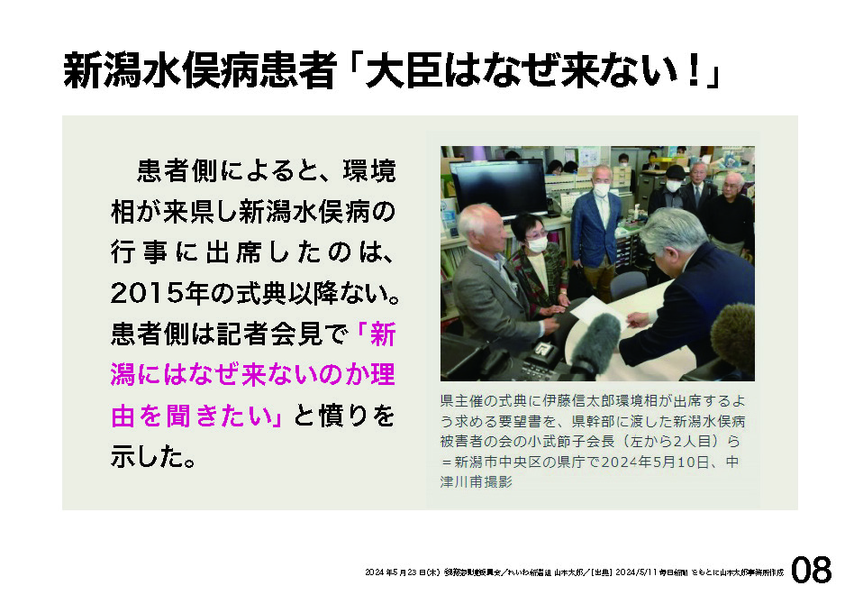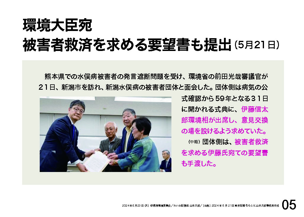 5月21日には、環境省の前田審議官、新潟市を訪れ、新潟水俣病の被害者団体から環境大臣に宛てた被害者救済を求める要望を受け取っております。