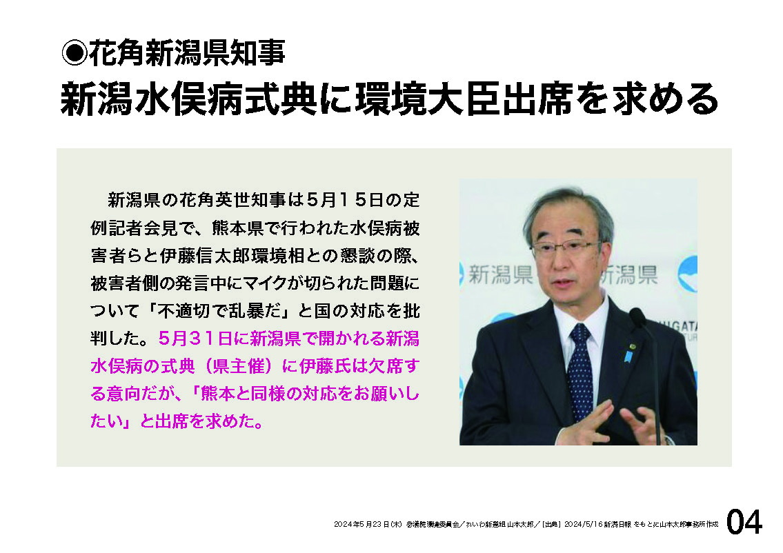 それを受けて、新潟県の花角知事は、定例記者会見で、5月31日、新潟県で開かれる県主催の新潟水俣病の式典に熊本と同様の対応をお願いしたいと伊藤大臣の出席を求めました。