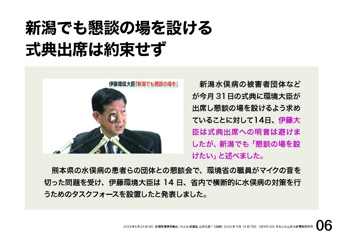 一方で、国会日程が合わずとも、式典に出られなくても今後新潟において懇談の場を設ける可能性を、大臣は何かにおわせるような発言されています。要は、国会で無理だったとしても、後々そういうタイミングを持つよというようなことを言われているわけですけれども。水俣市の懇談の場でのマイク切り、これについて大臣は謝罪をされたわけですから、ほかの地域でも機械的に時間を区切ってマイクを切るような同じ運用、今後繰り返すことは許されません。