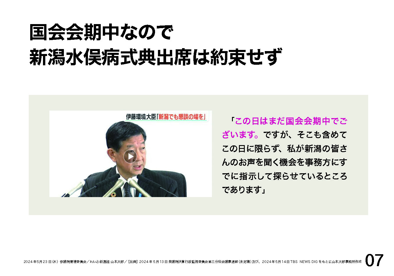参議院では、温暖化対策法の審議1本のみ。この法案の衆議院での審議時間は6時間ですから、通常国会終わりまでのスケジュールを考えても、必ずしも参議院で5月31日に本委員会を開く必要性というのはないと思うんです。公害問題に真摯に向き合うために誕生した環境省の歴史を鑑みても、この場面で新潟の式典には出ないという選択は避けるべきだと思うんですね。