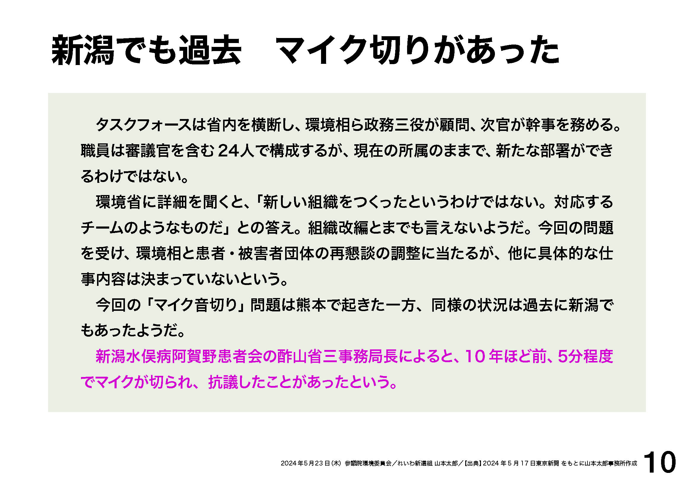 新潟水俣病阿賀野患者会の酢山事務局長によると、10年ほど前、5分程度でマイクが切られ、抗議したことがあったというんですね。