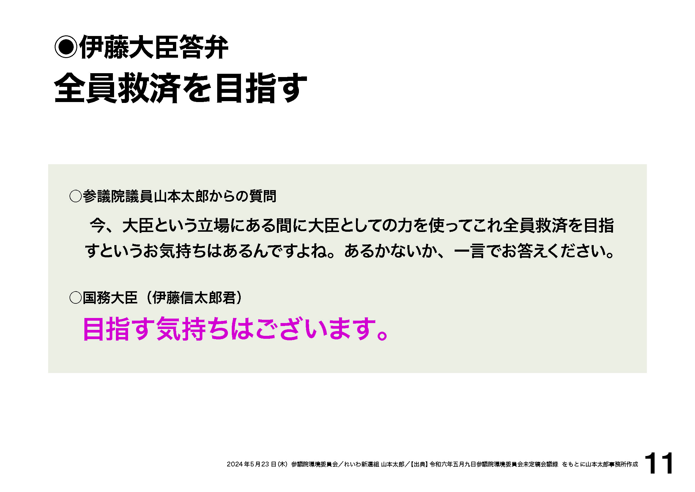 5月9日の委員会で、大臣という立場にある間に大臣としての力を使って全員救済を目指すというお気持ちはあるんですよねとお聞きしました。大臣からは目指す気持ちがあると頼もしい答弁をいただきました。
