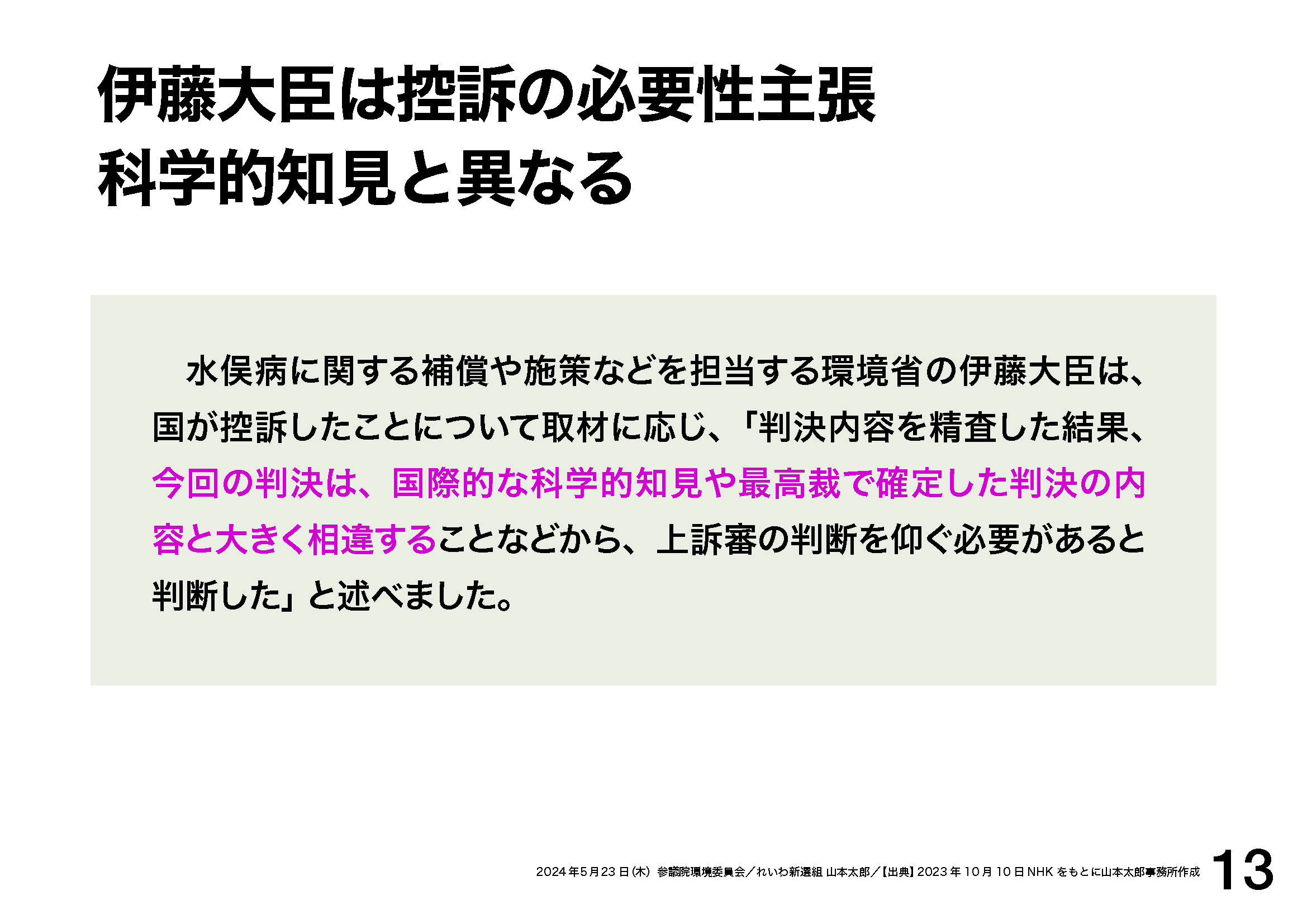 今回の判決は、国際的な科学的知見、最高裁で確定した判決の内容と大きく相違する、上訴審の判断を仰ぐ必要があると判断した、そう言っているんです。被害者を踏みにじるむちゃくちゃな発言だなって。これ伊藤大臣のご発言なんですね。