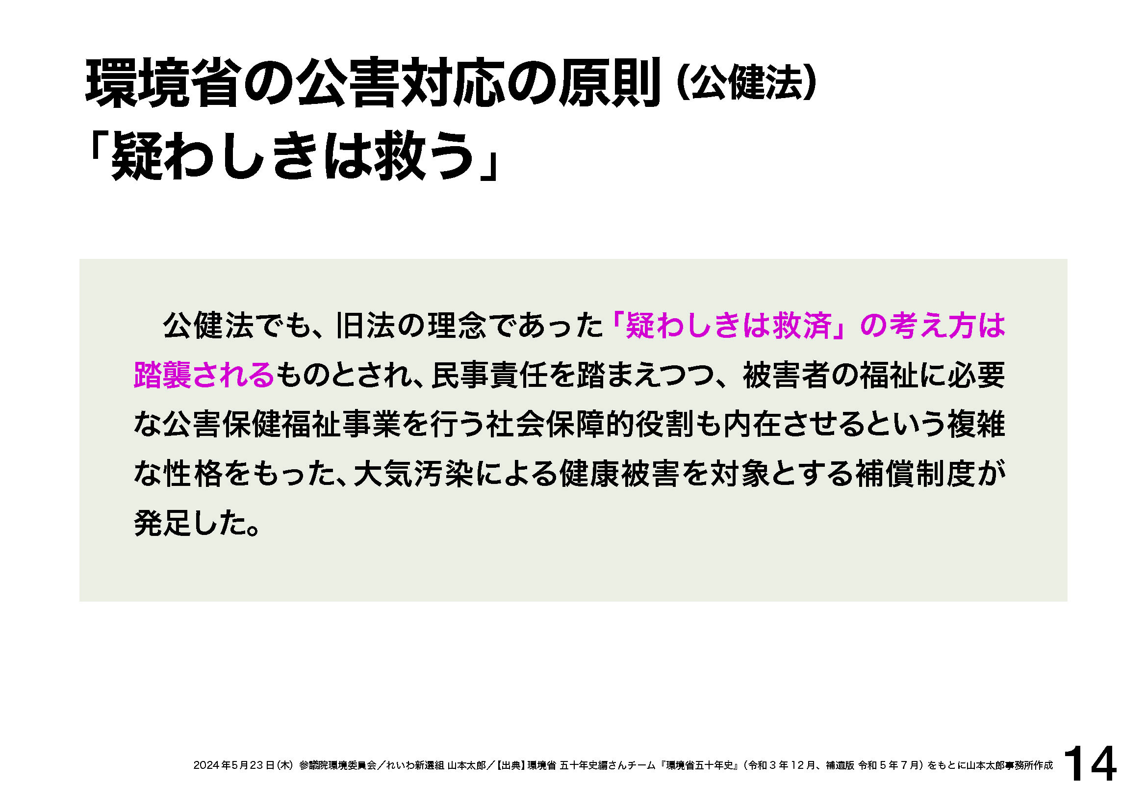 環境省五十年史、これによれば、公害健康被害補償法では「疑わしきは救済」の考え方が適用されると述べられているんですよ。疑わしきは救済なんですね。