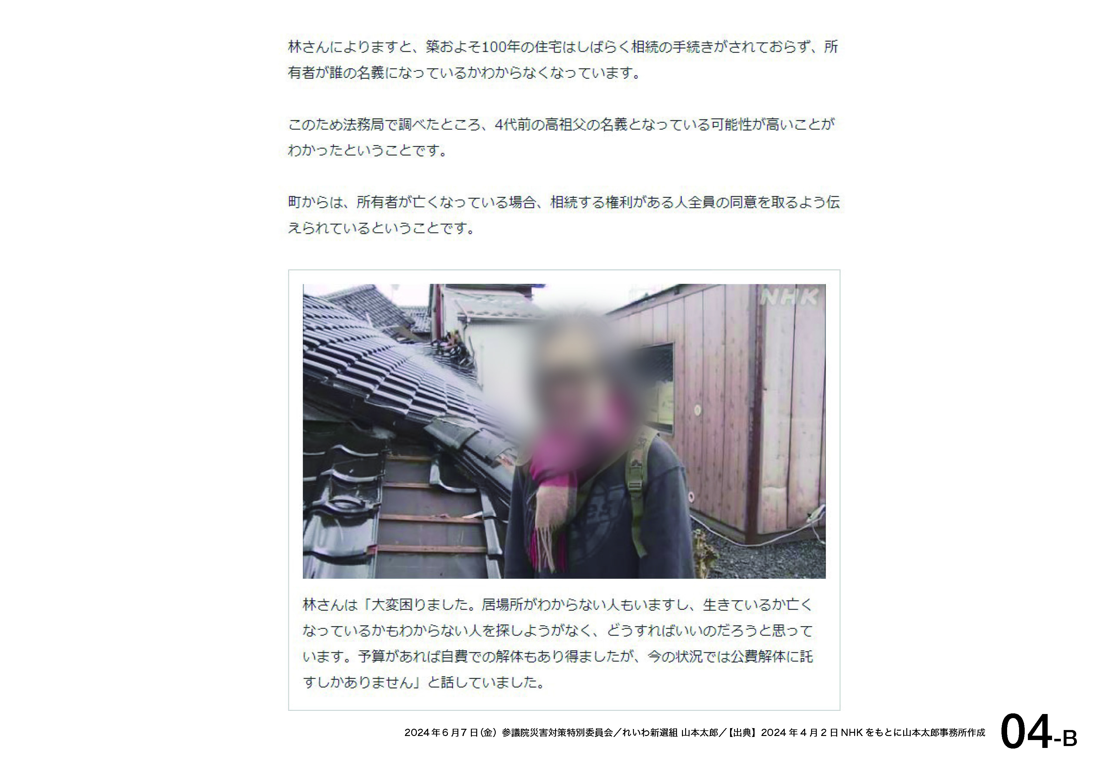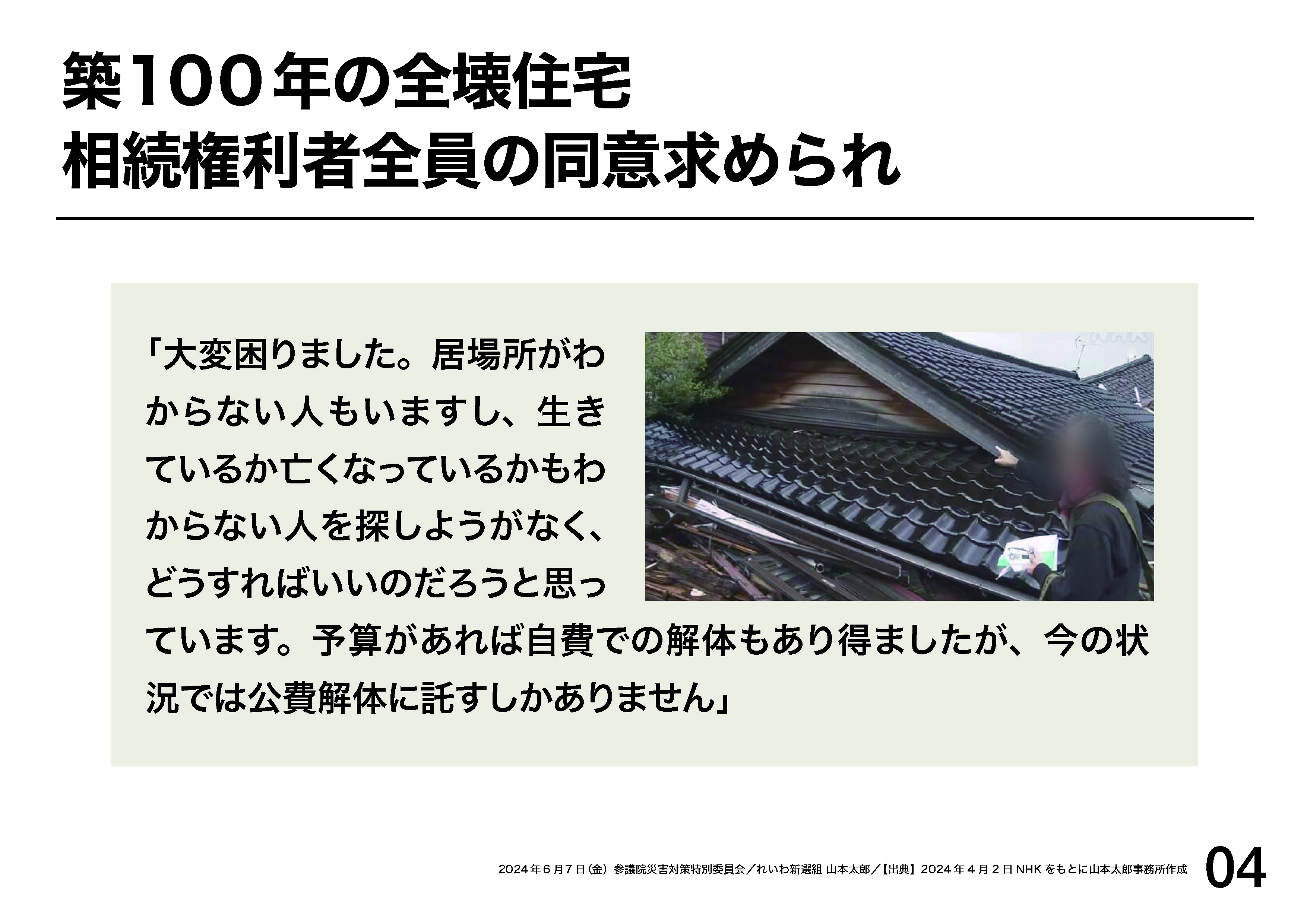 穴水町の被災者の状況。築100年の住宅が全壊。公費解体申請したいが、4代前の名義のままで、相続権者全員の同意を取るように求められた。ほかにも権利者が30人に及ぶケース、ほかにもブラジルに移住してしまった人のケースなどなど、様々が報じられております。