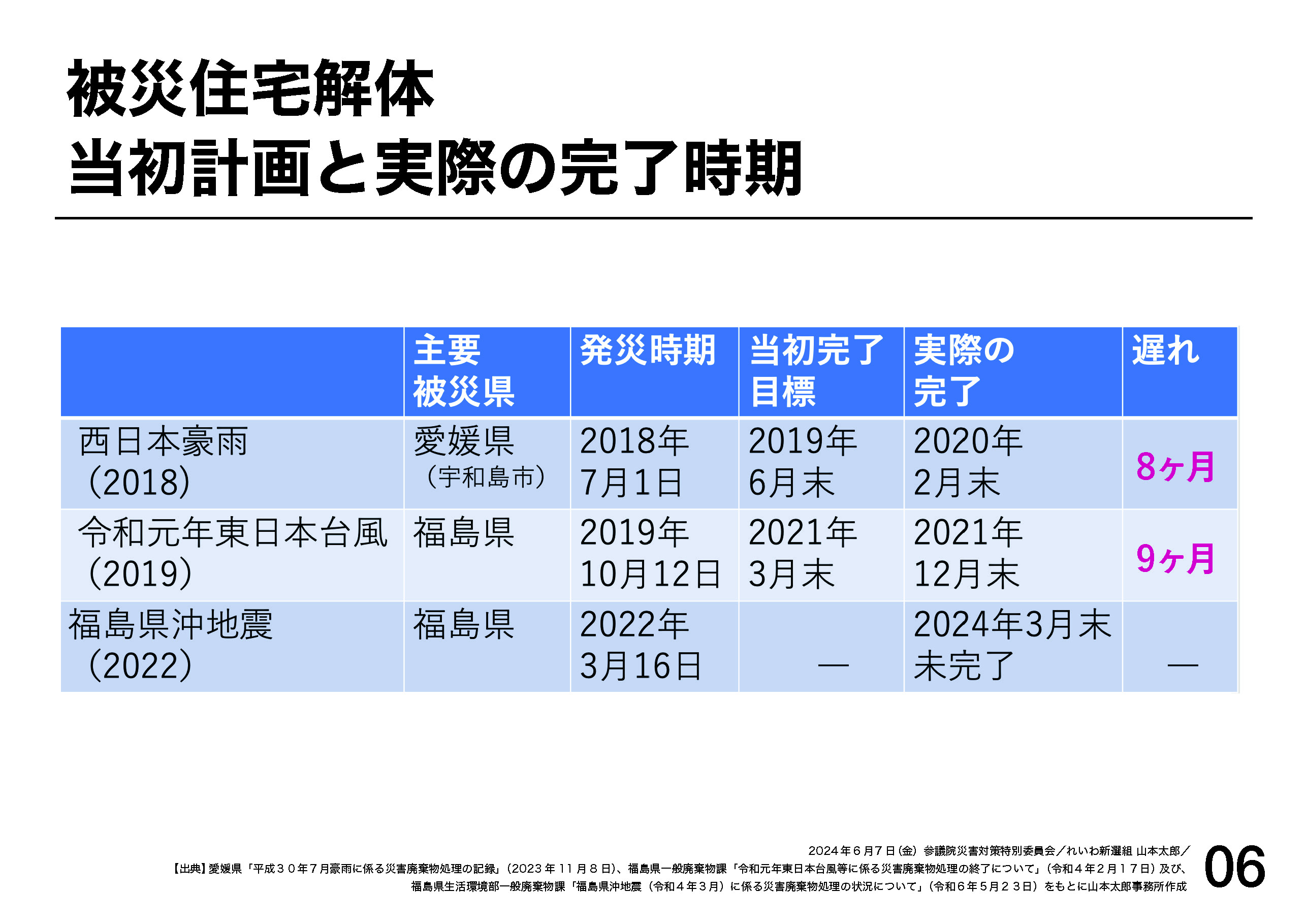過去の災害では、解体工事作業の遅れだけでなく、それ以前の所有権合意、業者不足、事業発注などの手続に相当の時間を要し、目標時期に完了しなかった事例も多い。