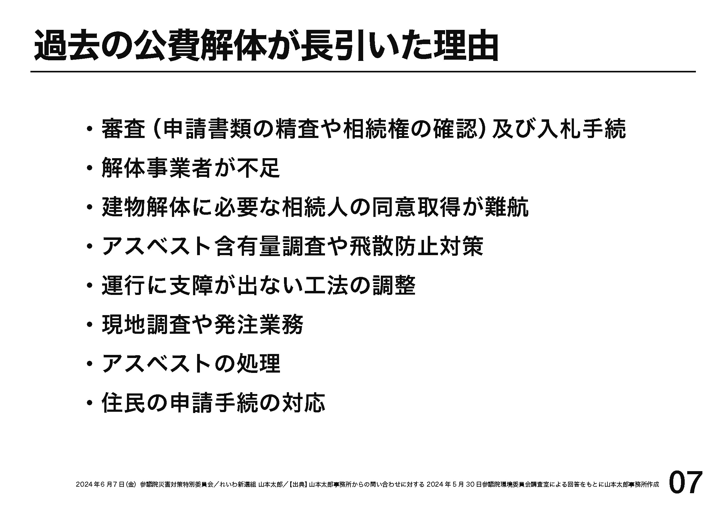 少なくとも7市7町では宣誓書方式の導入をためらっている。その理由は、住宅を解体した後、申請者以外の所有権者が解体した後に現れてきて解体を実施した自治体を訴えるという訴訟リスクがあるからとも言われます。宣誓書を取ったとしても、全員の同意を取っていない以上、自治体が訴えられるリスクは消えません。それに加えて、地元住民がリスクを負うということにも気が引けているのではないでしょうか。