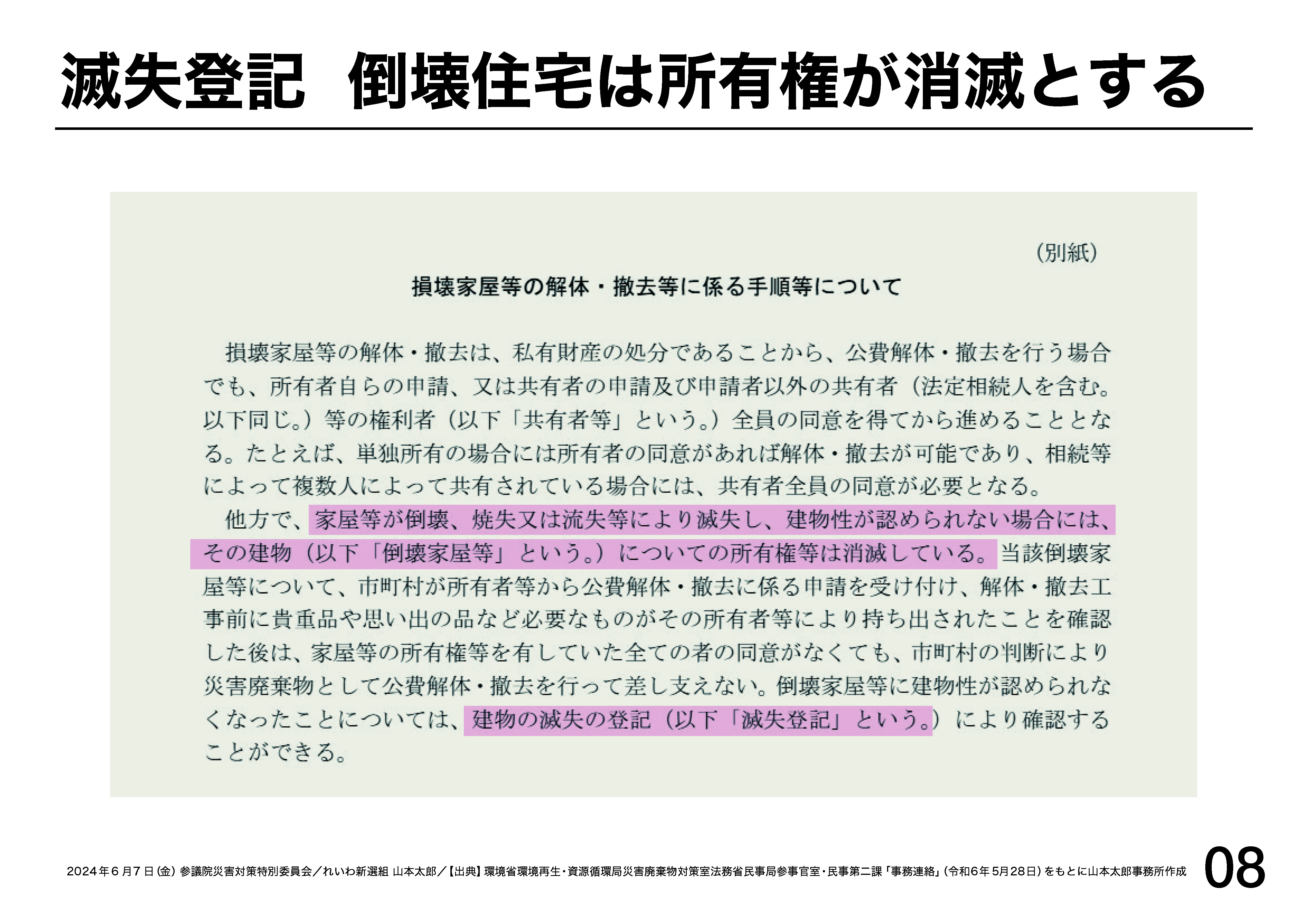 1、宣誓書方式で公費解体を進めるに際して、市町村ではなく国が公費解体実施責任者となる。自治体や地元住民を訴訟リスクから守るということです。解体申請者以外の所有権者から訴えがある場合、国が解体実施責任主体として対応するよう制度を改正する。