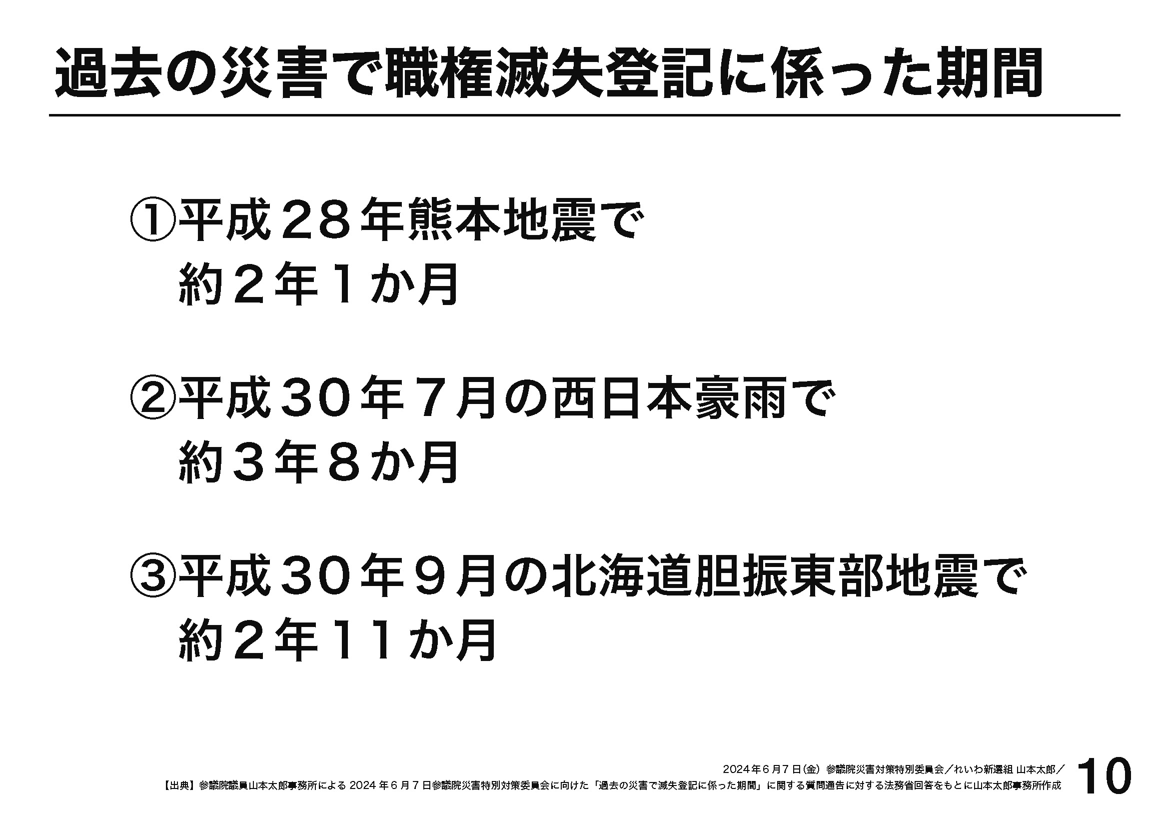 まず、法律につきましては詳細を詳しく存じ上げませんのでコメントは差し控えさせていただきたいと思いますが、いずれにいたしましても、先ほども、ちょっと委員はいらっしゃらなかったんですが、差し替え前に、公費解体のお話をさせていただく中で、今日おいでの角倉次長とも2週間ほど前から、加速させねばならないと、そこが根詰まりしている原因は何なのかというようなことを検討してまいり、補償コンサルをやはり増員すること、それから待ちの状態をいち早くつくること、その中でのやはり申請につきましては、滅失登記の手段を選んだところでございます。