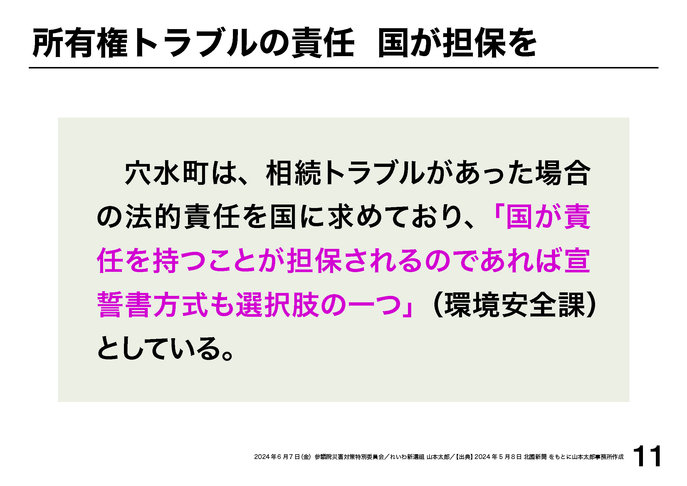 穴水町は相続トラブルがあった場合の法的責任を国に求めており、同町の環境安全課は、国が責任を負ってくれるなら宣誓書方式も選択肢になるとおっしゃいます。