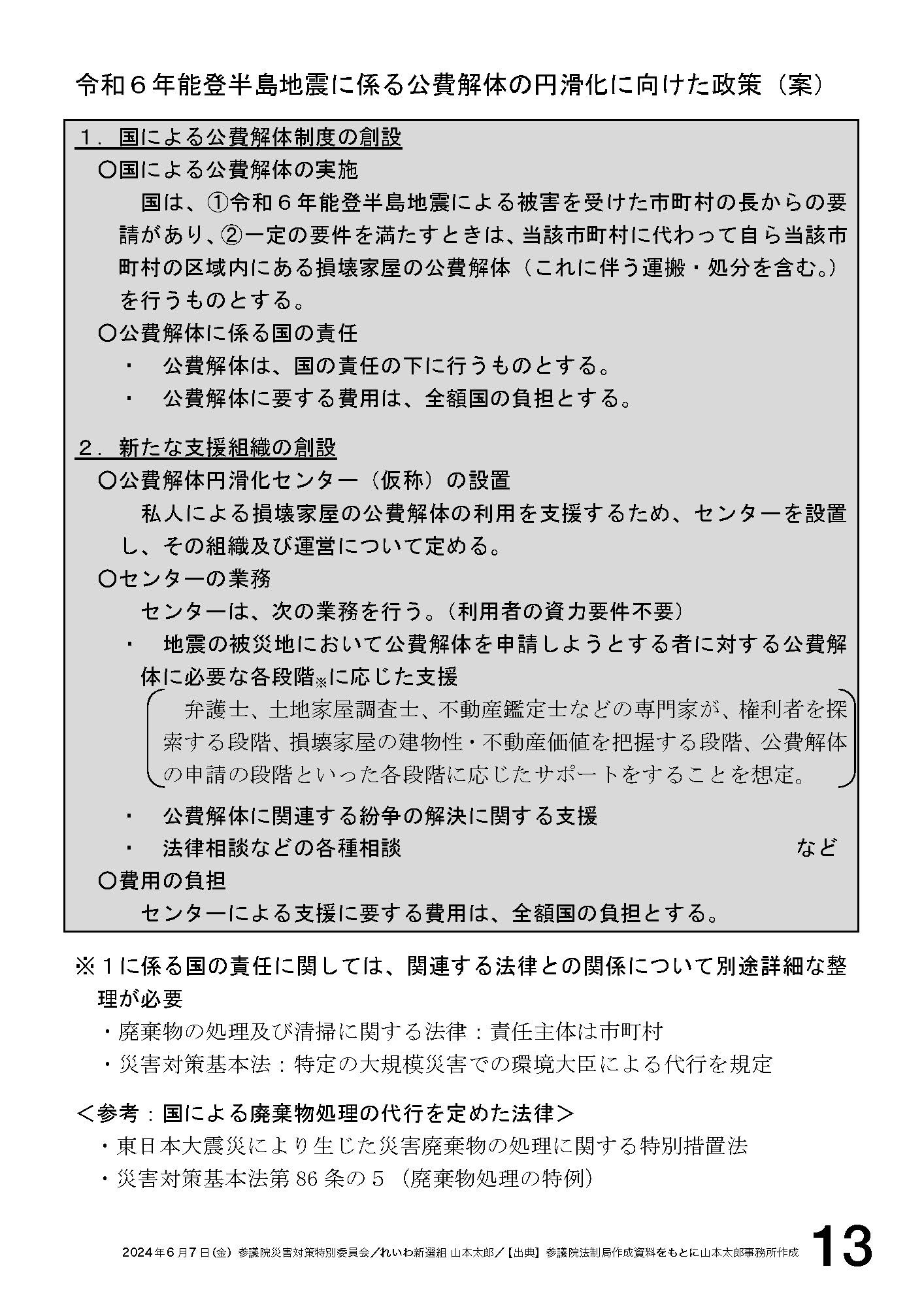 能登半島地震の公費解体に特化した措置法が必要です。そのイメージを法制局に整理してもらいました。
