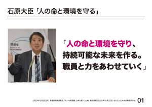 大臣は就任記者会見で、「人の命と環境を守る」と抱負を述べられました。