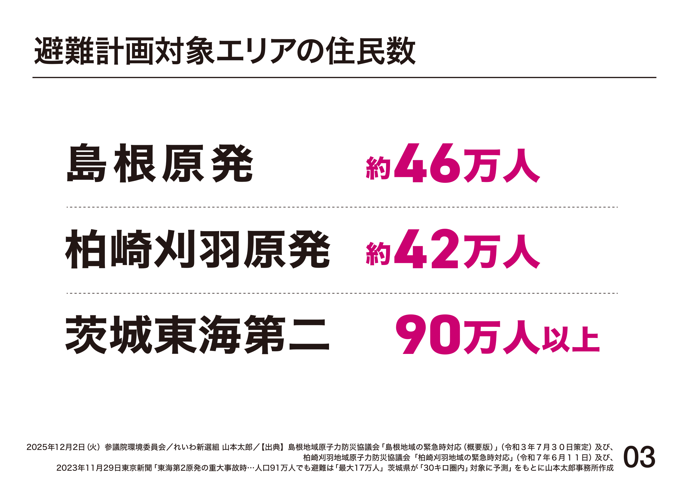 島根原発、46万人以上、柏崎刈羽、40万人以上、茨城東海第二、90万人以上。